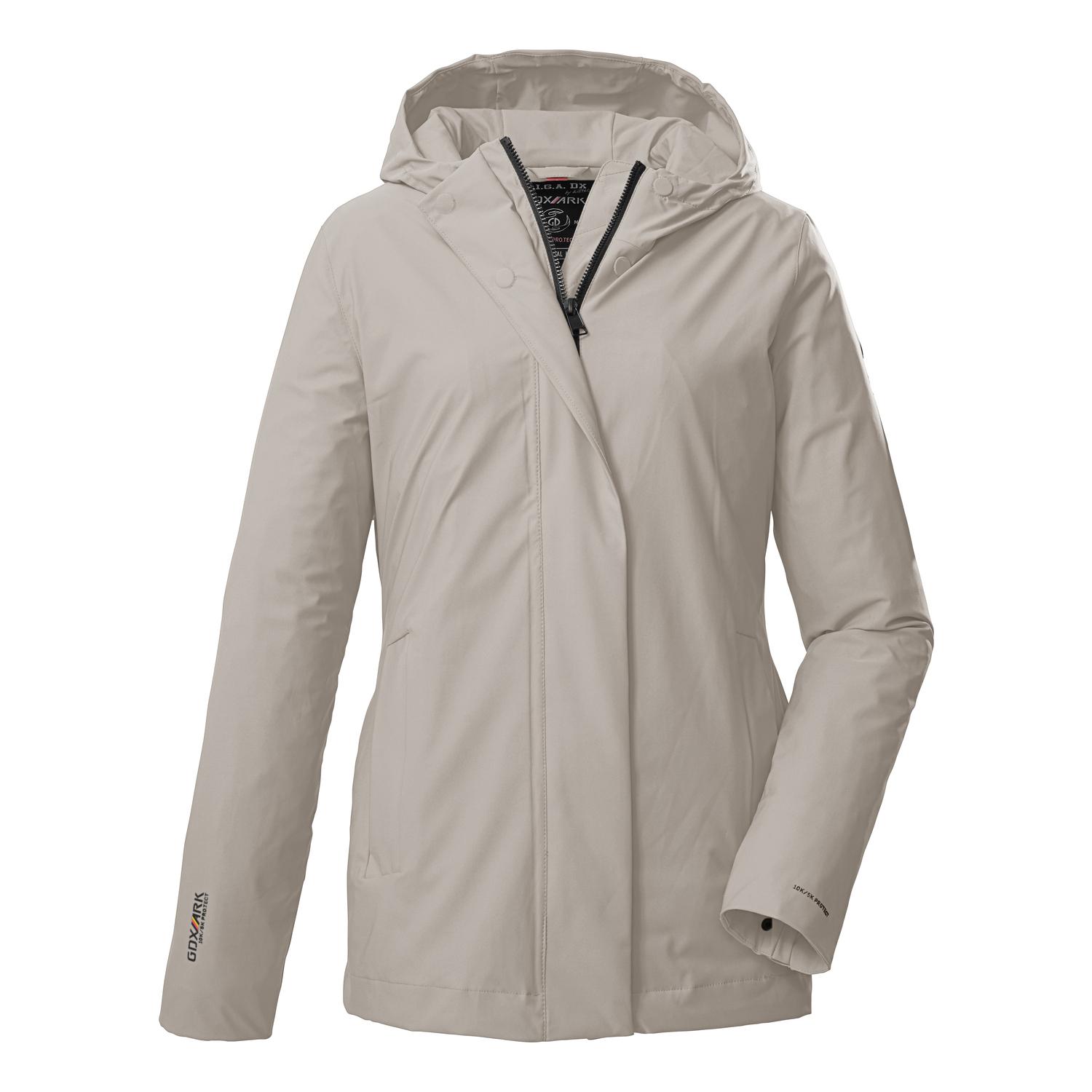 Damen Funktionsjacke mit verstellbarer Kapuze10.000 mm Wassersäule, verschweißte Nähte, 100% wasserdichtatmungsaktiv (5.000 g/m²/24 h) und winddichtverdeckter Reißverschluss mit KinnschutzPFAs-freie Imprägnierung, aus recyceltem MaterialName: GS 152 WMN JCKTSaison: Frühjahr/SommerDie Damen Funktionsjacke aus der G.I.G.A DX Kollektion ist der perfekte Begleiter an kühlen Sommertagen und in der Übergangszeit. Die Jacke hat verschweißte Nähte und ist wasser- und winddicht mit einer 10.000 mm Wassersäule. Dabei ist sie besonders atmungsaktiv mit einer Wasserdampfdurchlässigkeit von 5.000 g/m²/24 h. Die Ärmelabschlüsse und die Kapuze sind verstellbar. Die Übergangsjacke ist mit zwei seitlichen Taschen und einer Innentasche ausgestattet. Der verdeckte Frontreißverschluss ist mit einem Kinnschutz versehen, der das Einklemmen der Haut verhindert. killtec liegt es besonders am Herzen, die Kollektionen nachhaltiger und zukunftsfähiger zu machen. So setzt killtec verstärkt auf verantwortungsbewusstere Herstellungsverfahren. Diese Jacke wurde daher mit fluorfreien Mitteln imprägniert und wurde aus recyceltem Material hergestellt.
