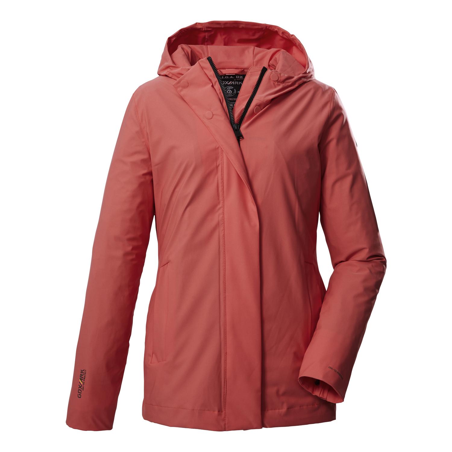 Damen Funktionsjacke mit verstellbarer Kapuze10.000 mm Wassersäule, verschweißte Nähte, 100% wasserdichtatmungsaktiv (5.000 g/m²/24 h) und winddichtverdeckter Reißverschluss mit KinnschutzPFAs-freie Imprägnierung, aus recyceltem MaterialName: GS 152 WMN JCKTSaison: Frühjahr/SommerDie Damen Funktionsjacke aus der G.I.G.A DX Kollektion ist der perfekte Begleiter an kühlen Sommertagen und in der Übergangszeit. Die Jacke hat verschweißte Nähte und ist wasser- und winddicht mit einer 10.000 mm Wassersäule. Dabei ist sie besonders atmungsaktiv mit einer Wasserdampfdurchlässigkeit von 5.000 g/m²/24 h. Die Ärmelabschlüsse und die Kapuze sind verstellbar. Die Übergangsjacke ist mit zwei seitlichen Taschen und einer Innentasche ausgestattet. Der verdeckte Frontreißverschluss ist mit einem Kinnschutz versehen, der das Einklemmen der Haut verhindert. killtec liegt es besonders am Herzen, die Kollektionen nachhaltiger und zukunftsfähiger zu machen. So setzt killtec verstärkt auf verantwortungsbewusstere Herstellungsverfahren. Diese Jacke wurde daher mit fluorfreien Mitteln imprägniert und wurde aus recyceltem Material hergestellt.