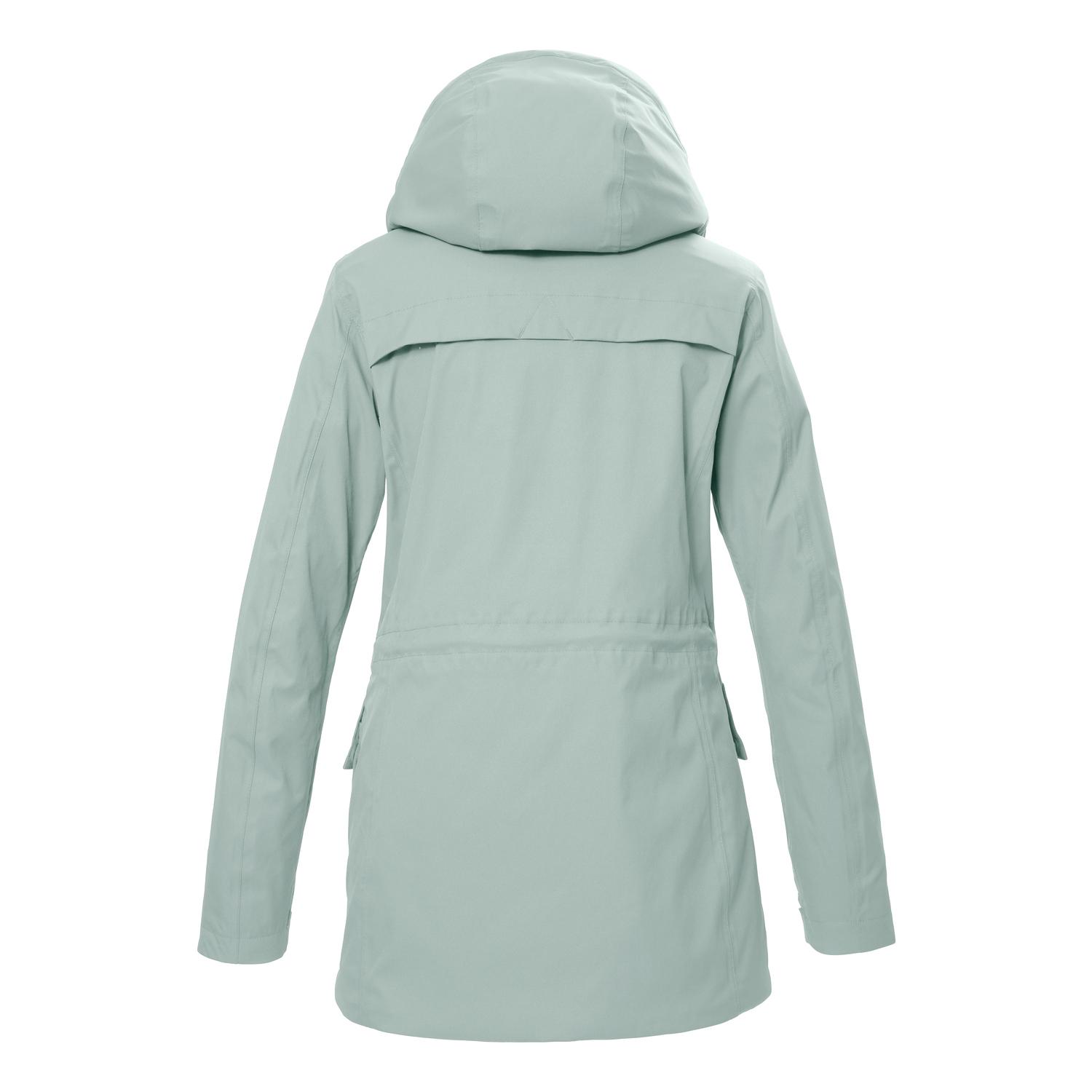 Damen Funktionsjacke mit abnehmbarer Kapuze verschweißte Nähte, wasserdicht (10.000 mm) atmungsaktiv (5.000 g/m²/24h) und winddicht 2-Wege-Reißverschluss mit Flap PFAS-frei imprägniert und recyceltes Material Name: GS 54 WMN JCKT Saison: Frühjahr/Sommer Die Damen Funktionsjacke aus der G.I.G.A DX Kollektion ist der perfekte Begleiter an kühlen Sommertagen und in der Übergangszeit. Die Jacke hat verschweißte Nähte und ist wasser- und winddicht mit einer 10.000 mm Wassersäule. Dabei ist sie atmungsaktiv mit einer Wasserdampfdurchlässigkeit von 5.000 g/m²/24 h. Die Kapuze mit Schirm ist abnehmbar. Die Übergangsjacke ist mit seitlichen Taschen und einer Innentasche ausgestattet. Der verdeckte 2-Wege-Reißverschluss ist mit einem Kinnschutz versehen, der das Einklemmen der Haut verhindert. Das Innere der Jacke ist mit einem komfortablen Mesh-Einsatz ausgestattet. killtec liegt es besonders am Herzen, die Kollektionen nachhaltiger und zukunftsfähiger zu machen. So setzt killtec verstärkt auf verantwortungsbewusstere Herstellungsverfahren. Diese Jacke wurde daher PFAS-frei imprägniert und wurde aus recyceltem Material hergestellt.