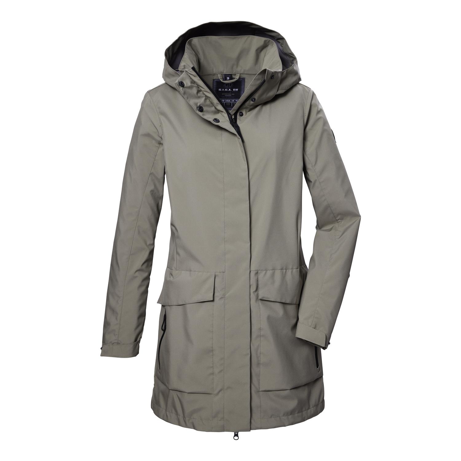Damen Softshellparka mit abzippbarer Kapuze wind- und wasserabweisend, Wassersäule 10.000 mm atmungsaktiv (5.000 g/m²/24 h) und winddicht PFAS-freie Imprägnierung und teilweise recyceltes Material Ärmelbündchen und Taillenweite regulierbar verdeckter 2-Wege-Reißverschluss, große Taschen Name: GS 95 WMN SFTSHLL PRK Saison: Frühjahr/Sommer Der Damen Softshellparka von G.I.G.A. DX hält widrigem Wetter stand und zeichnet sich gleichzeitig durch seinen urbanen Look aus. Mit einer Wassersäule von 10.000 mm ist der Parka wasser- und windabweisend. Dabei ist er atmungsaktiv mit einer Wasserdampfdurchlässigkeit von 5.000 g/m²/24 h. Die Ärmelbündchen sind durch Klettverschlüsse verstellbar, die Taillenweite lässt sich durch einen innenliegenden Tunnelzug regulieren. Der verdeckte 2-Wege-Reißverschluss lässt sich von oben und unten öffnen und sorgt so für Bewegungsfreiheit. Zwei große aufgesetzte Taschen bieten Stauraum für Handy, Schlüssel und Co. killtec ist ständig bestrebt, die Kollektionen nachhaltiger und zukunftsfähiger zu machen. So setzt killtec verstärkt auf verantwortungsbewusstere Herstellungsverfahren. Dieser Parka wurde daher PFAS-frei imprägniert und teilweise aus recyceltem Material gefertigt!
