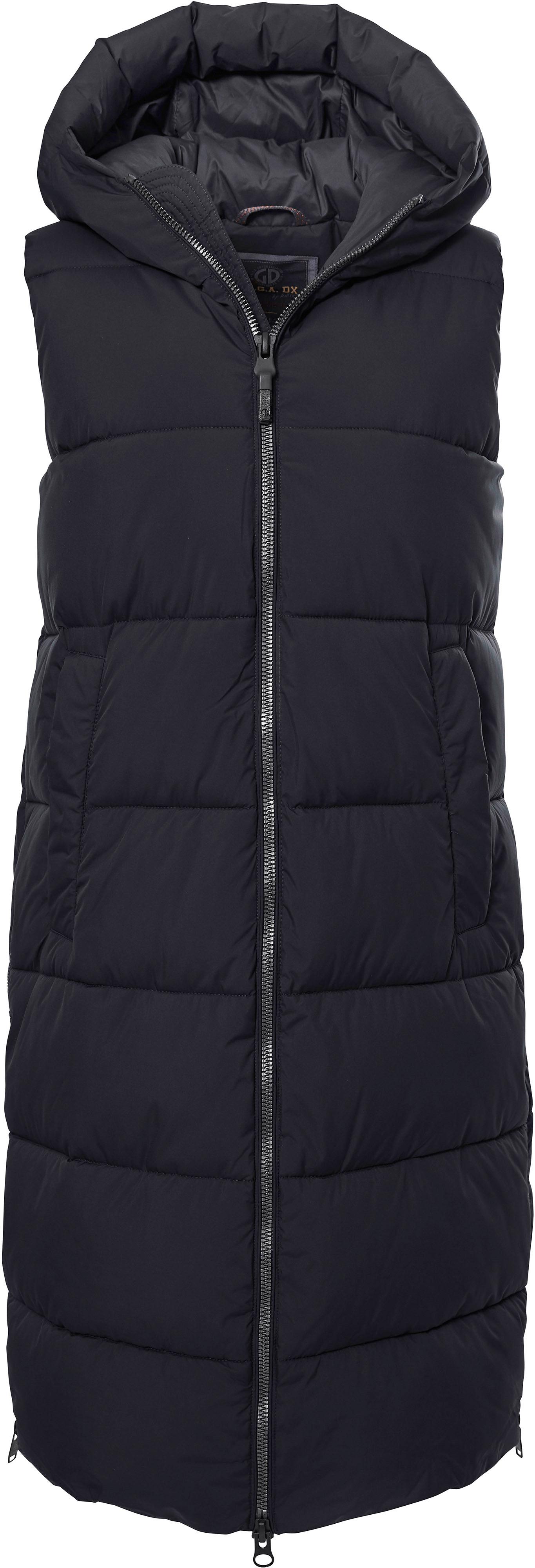 Lange Steppweste mit Kapuze für Damen; 2-Wege-Reißverschluss; seitliche Eingrifftaschen; seitliche Reißverschlüsse am Saum für mehr Bewegungsfreiheit und Belüftung; wärmende Kunstfaser-Isolierung; normale Passform; Material 100% Polyester.