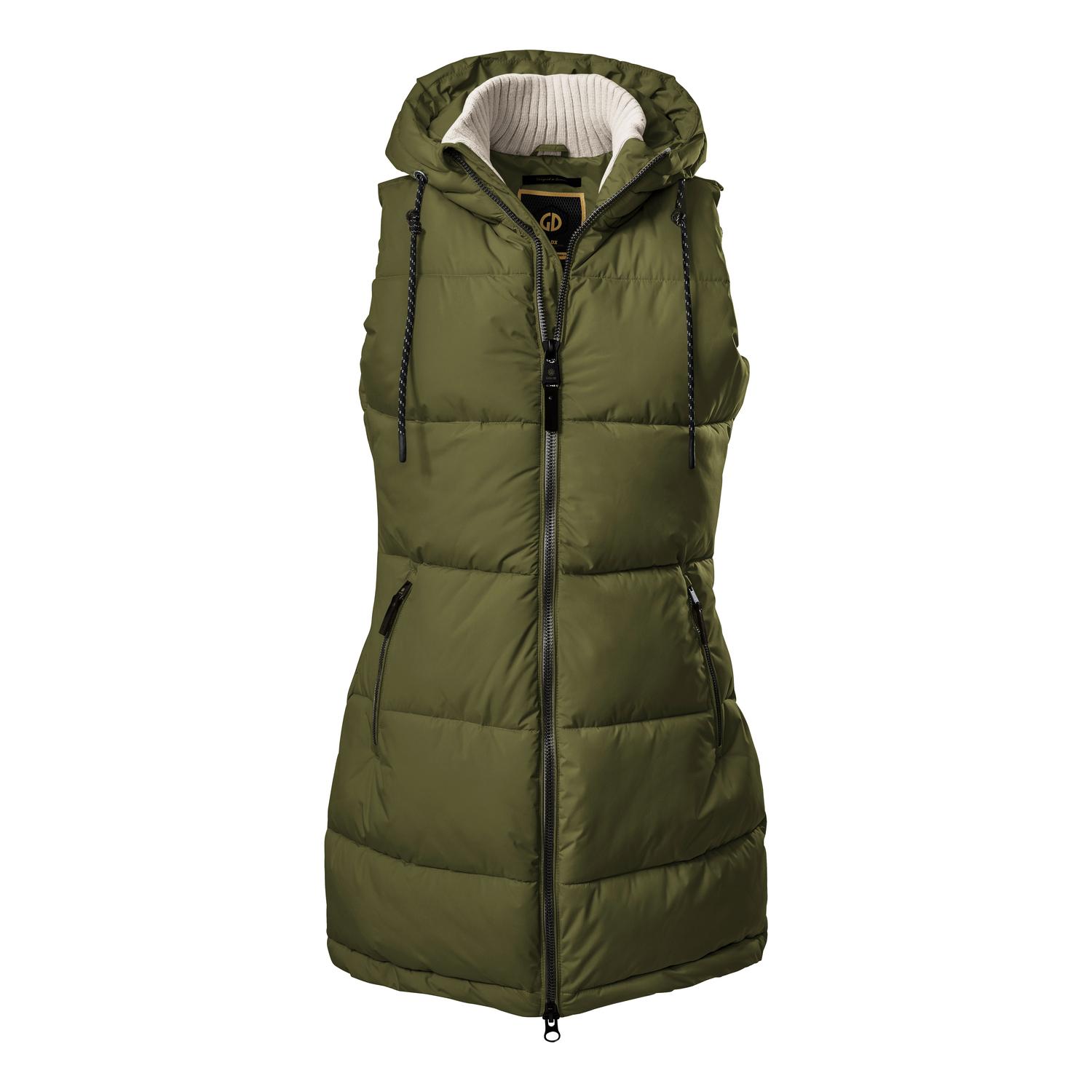 Damen Funktionsweste in Daunenoptik mit Kapuzewasserabweisend, (8.000 mm) und winddichtlanger Schnitt, Saum regulierbar, praktische Taschen2-Wege-Reißvschluss mit KinnschutzPFAs-freie Imprägnierung, recyceltes MaterialName: GW 30 WMN QLTD VSTSaison: Herbst/WinterMit der langen Funktionsweste in Daunenoptik von G.I.G.A. DX liegt man voll im Trend. Die Steppweste ist wasserabweisend, winddicht und gleichzeitig atmungsaktiv. Die Kapuze und der bequeme Strickkragen schützen zusätzlich vor Kälte und Wind. Die Weite vom Saum kann anhand eines Kordelzuges reguliert werden. Zwei Reißverschlusstaschen und eine Innentasche bieten Stauraum für Handy, Schlüssel und Co. Der 2-Wege-Reißverschluss ist mit einem praktischen Kinnschutz versehen, der ein Einklemmen der Haut verhindert. killtec liegt es besonders am Herzen, die Kollektionen nachhaltiger und zukunftsfähiger zu machen. So setzt killtec verstärkt auf verantwortungsbewusstere Herstellungsverfahren. Diese Weste wurde daher mit fluorfreien Mitteln imprägniert und teilweise aus recyceltem Material hergestellt.