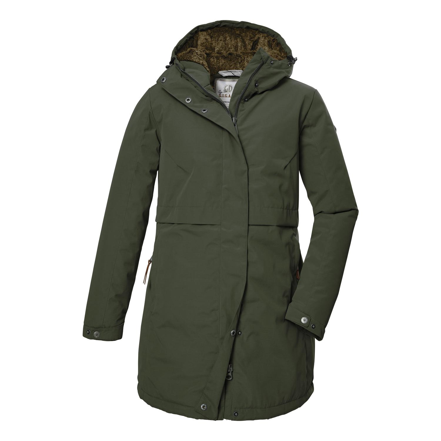 Damen Winter-Funktionsparka mit Kapuzewasserabweisend, (8.000 mm), atmungsaktiv, winddichtkuschelig warmes Teddyfell innenverdeckter 2-Wege-Reißvschluss mit KinnschutzPFAs-freie Imprägnierung, gut für dich und die UmweltName: GW 41 WMN PRKSaison: Herbst/WinterDer trendige Damen Funktionsparka von G.I.G.A. DX ist nicht nur citytauglich, sondern auch auf Winterspaziergängen eine gute Wahl. Mit kuscheligem Teddyfell gefüttert hält er besonders warm. Der Parka ist wasserabweisend und winddicht mit einer 8.000 mm Wassersäule und gleichzeitig atmungsaktiv. Der verdeckte 2-Wege-Reißverschluss lässt sich von unten und oben öffnen und sorgt so für Bewegungsfreiheit trotz der Länge des Parkas. Der Kinnschutz verhindert ein Einklemmen der Haut. Die Ärmelbündchen sind durch Druckknöpfe verstellbar und der Saum lässt sich mit einem Kordelzug regulieren. Die zwei Eingrifftaschen sind mit Zippern verschließbar, eine Innentasche bietet sicheren Stauraum für das Handy. killtec liegt es besonders am Herzen, die Kollektionen nachhaltiger und zukunftsfähiger zu machen. So setzt killtec verstärkt auf verantwortungsbewusstere Herstellungsverfahren. Diese Jacke wurde daher mit fluorfreien Mitteln imprägniert.