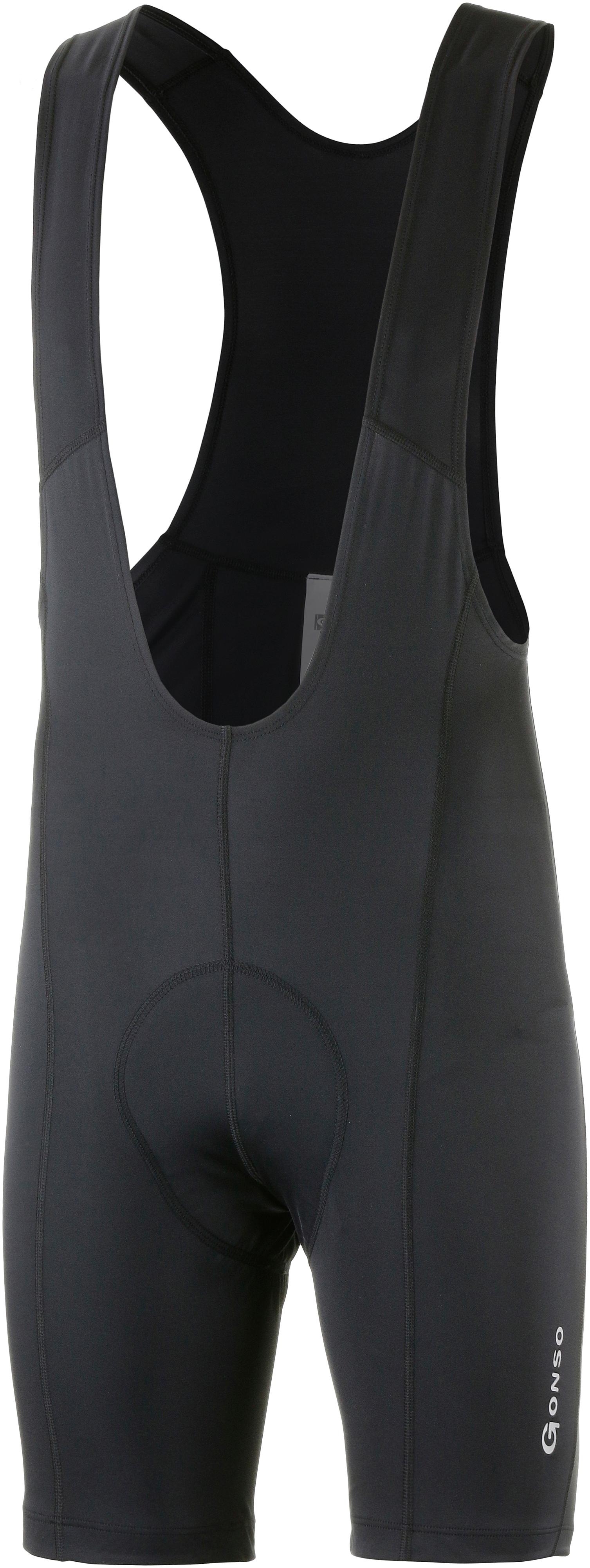Gonso BIKEBIB TEGLIO V2. Elastische Biketights mit anatomisch geformtem Sitzpolster, ermöglicht optimale Druckentlastung. Dank Drying und Air Funktion werden Hitze und Feuchtigkeit schnell vom Körper abtransportiert. Und das Polster liefert mit unterschiedlichen Densitätsgraden strategisch ausgeklügelten Komfort, speziell für längere Trekkingbiketouren. Die Polsterbasis mit bewegungsoptimierter Längs-, Quer- und Diagonaldehnung (40Density) ist etwas niedriger, um Bewegungsfreiheit und Ventilation zu gewährleisten. Im Front- und Rückbereich sind die Schaumstoffkissen mit einer höheren Densität (80Density) ausgestattet, um mehr Stabilität zu schaffen; Material 80% Polyamid, 20% Elastan.
