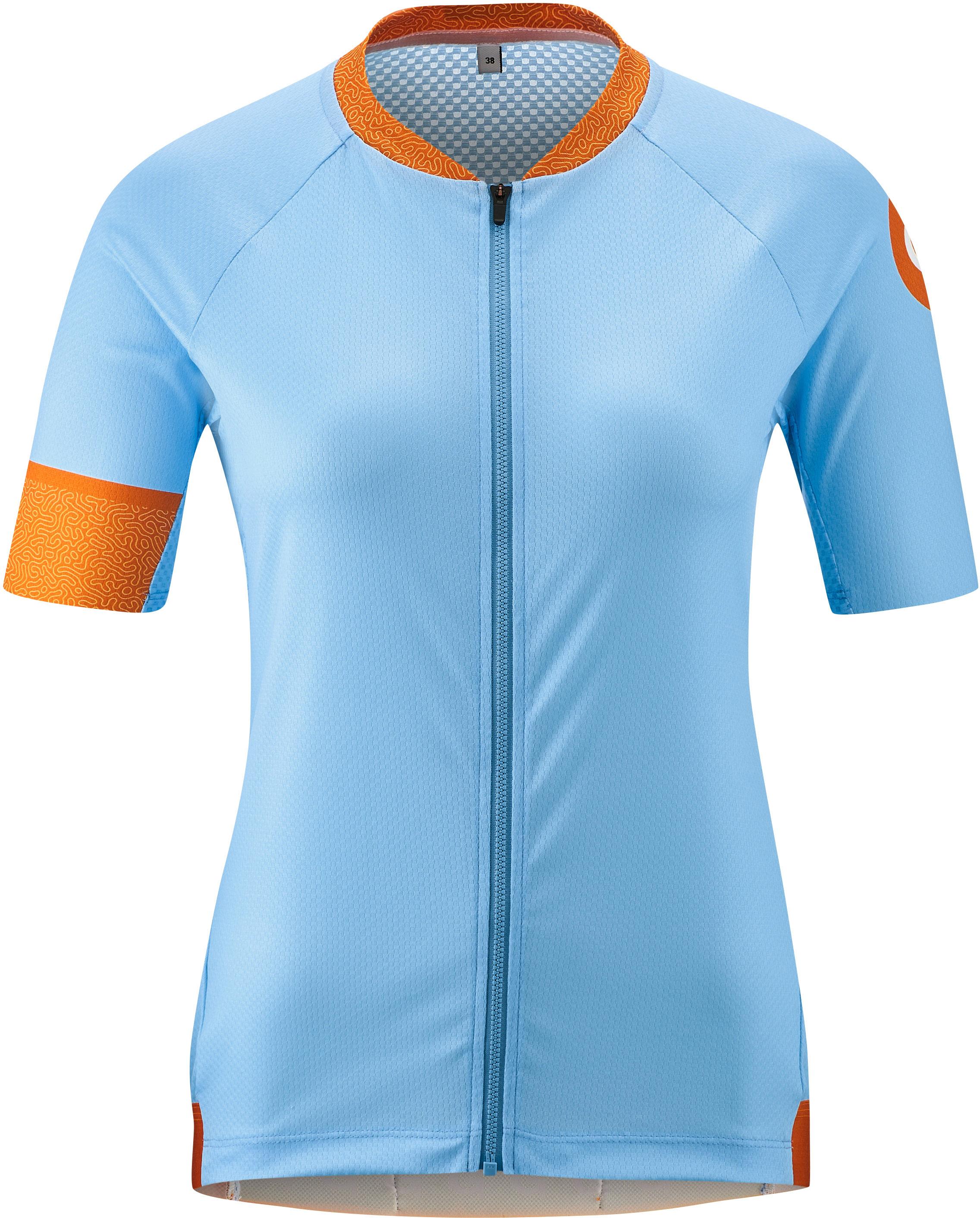 Fahrradtrikot mit durchgehendem Reißverschluss auf der Vorderseite; kurzer Kragen; verlängerte Ärmel; belüftende Mesh-Einsätze im oberen Rückenbereich; 3-teilige Rückentasche mit zusätzlicher Reißverschlusstasche; Fair Wear Foundation; Material 100% Polyester.