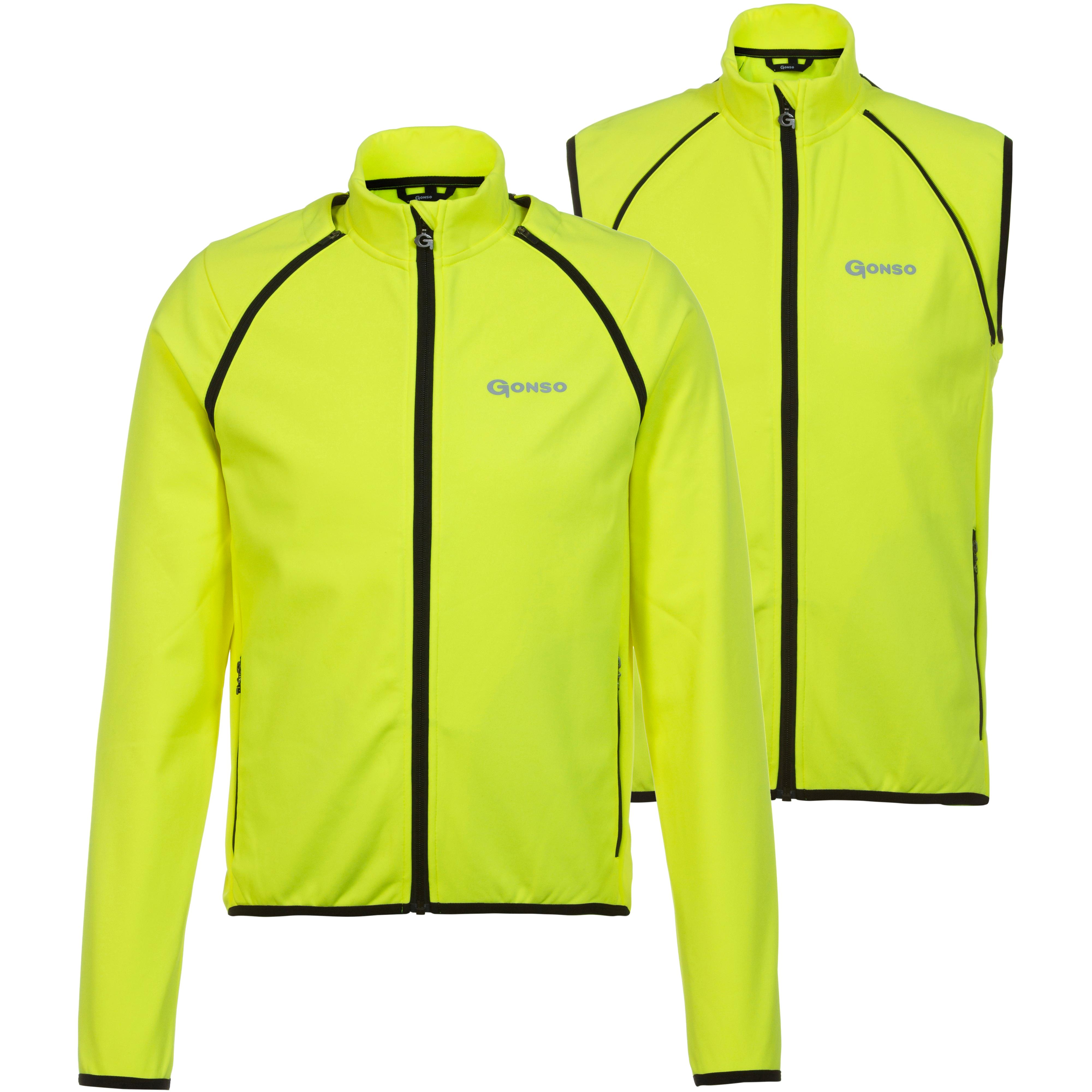 Fahrradjacke mit abzippbaren Ärmeln und auch als Weste tragbar; aus elastischem G-Shell mit weicher Fleece-Innenseite; winddicht; wasserabweisend; feuchtigkeitsableitend; Kinnschutz am Stehkragen; unterlegter Frontreißverschluss; 2 Reißverschlusstaschen; Abschlüsse mit schmalen Elastikbündchen; 1 Reißverschlusstasche auf der Rückseite; rutschfester Saum mit Silikon-Prints und verlängertem Rückenteil; reflektierende Details; Material 100% Polyester.
