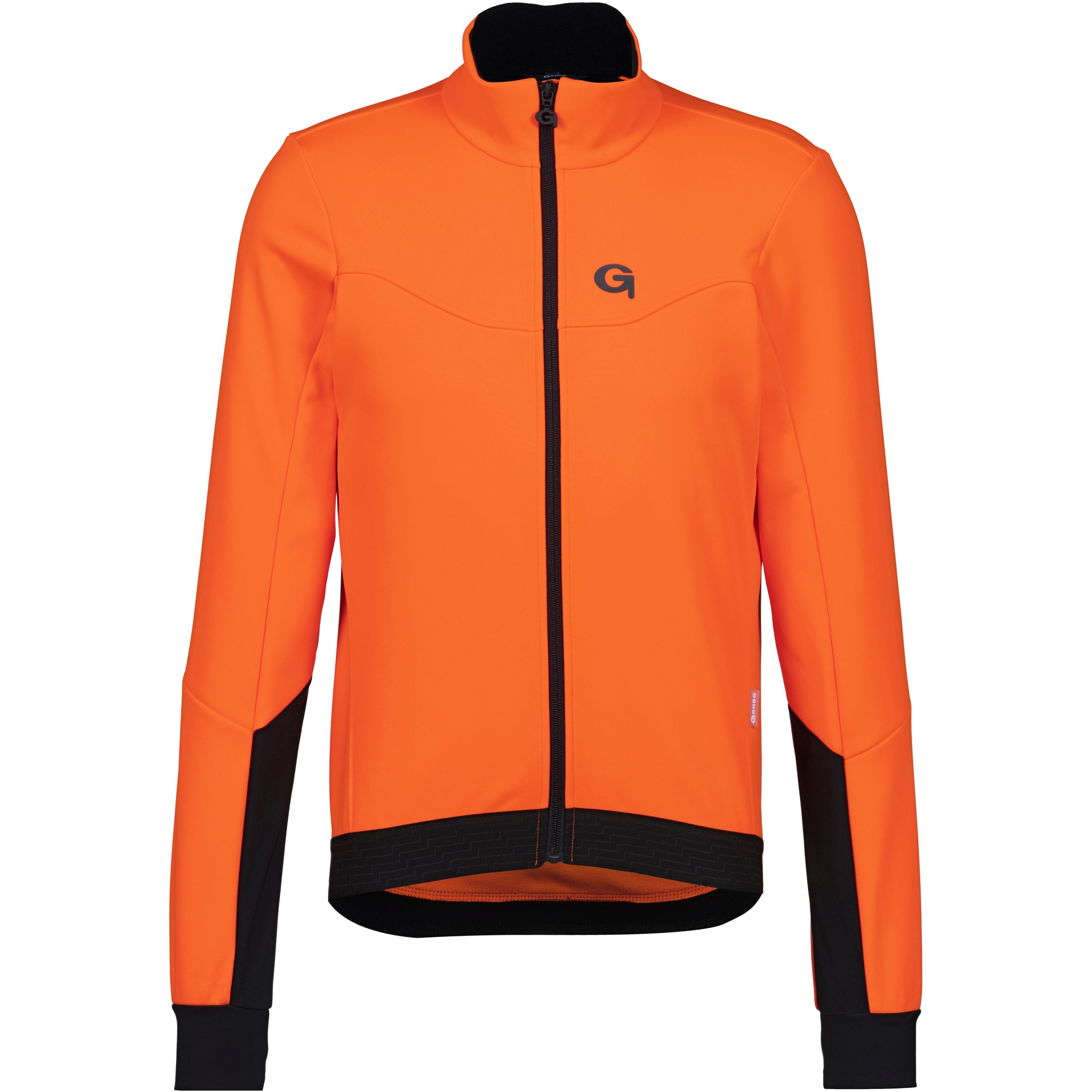 Fahrradjacke aus innovativem G-Shell mit wärmender, winddichter und atmungsaktiver Eigenschaft; Stehkragen; durchgehender Frontreißverschluss; Ärmelabschlüsse mit Bündchen; 1 Reißverschlusstasche auf der Rückseite; leicht verlängertes Rückenteil; reflektierende Details; die Thermoeinsätze sorgen perfektes Klima auch bei kalten Bedingungen; schmale Passform; Material 100% Polyester.