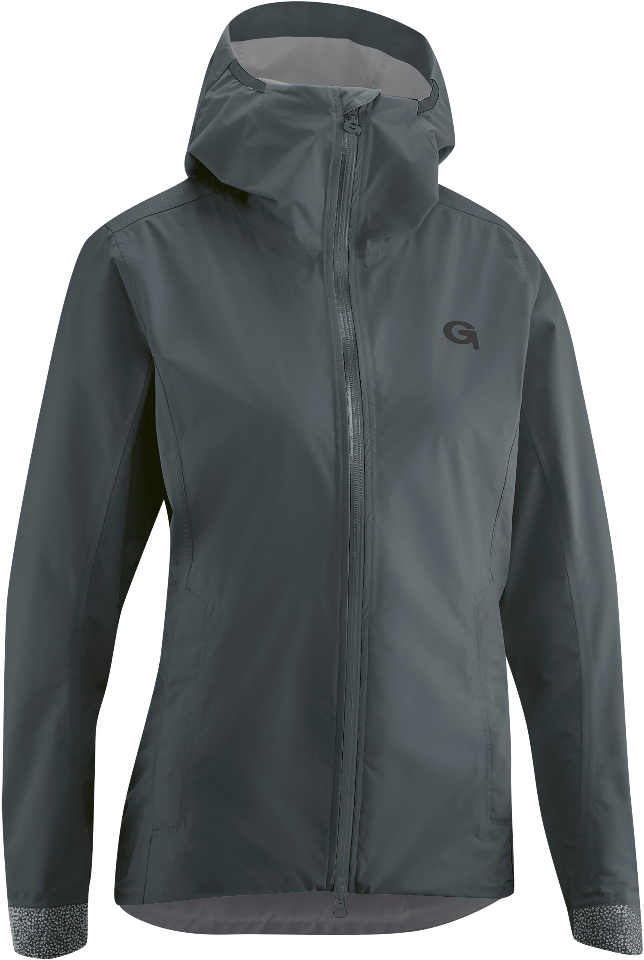 Fahrradjacke aus 2,5 lagigem Laminat und wind- und wasserdichter G-Tex-Membran; getapte Nähte; Wassersäule 10.000 mm; feste Kapuze; Kinnschutz am Kragen; wasserabweisender Frontreißverschluss; körpernahe Passform; atmungsaktiv; asymmetrische Ärmelabschlüsse; verlängertes Rückenteil; Material 100% Polyester.