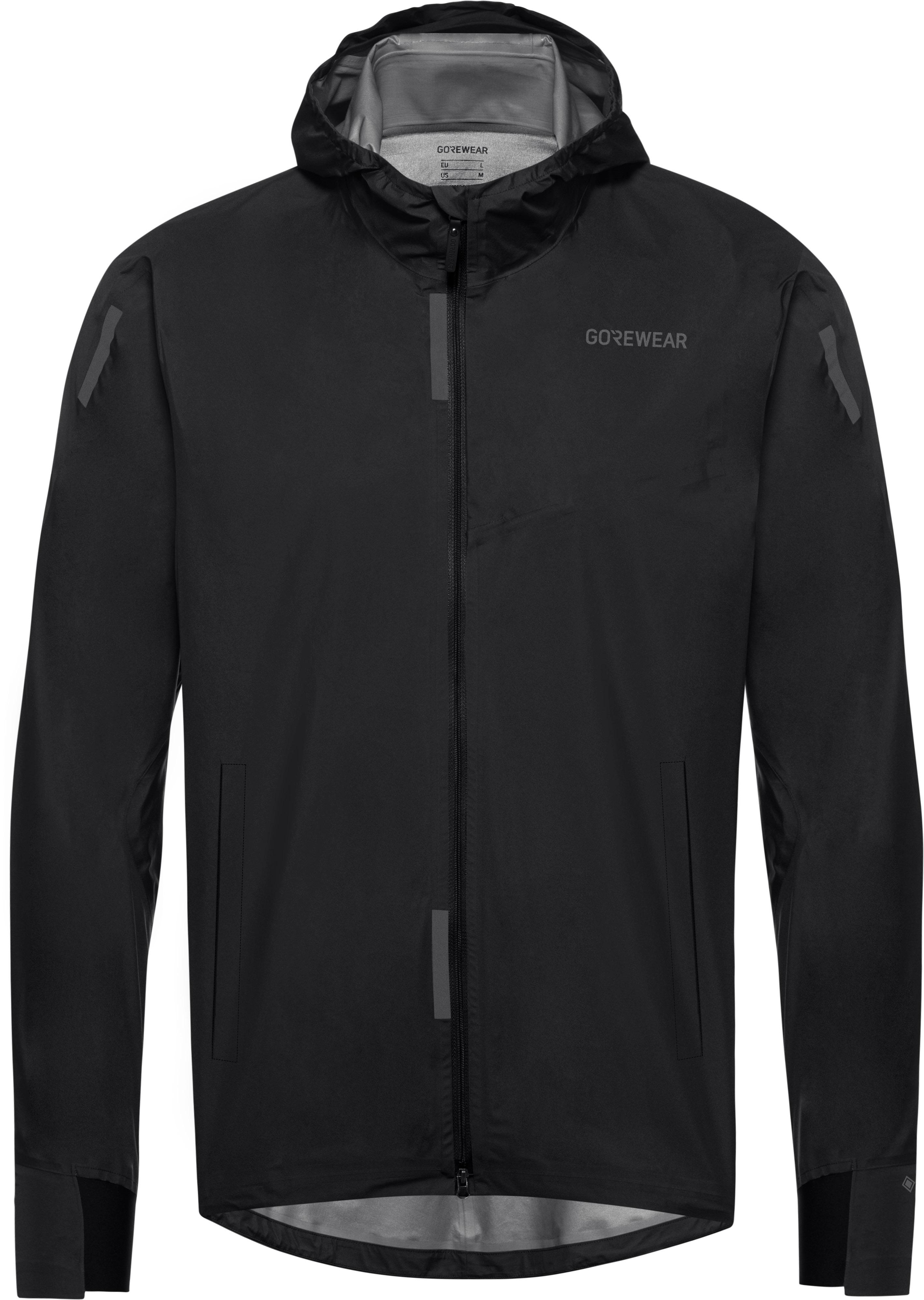 Laufjacke mit atmungsaktiver, wind- und wasserdichter GORE-TEX-Ausstattung; feste Kapuze; 2-Wege-Frontreißverschluss mit Kinnschutz; leicht verlängerte Rückseite; Labelprint und reflektierende Details; Material 100% Polyamid.