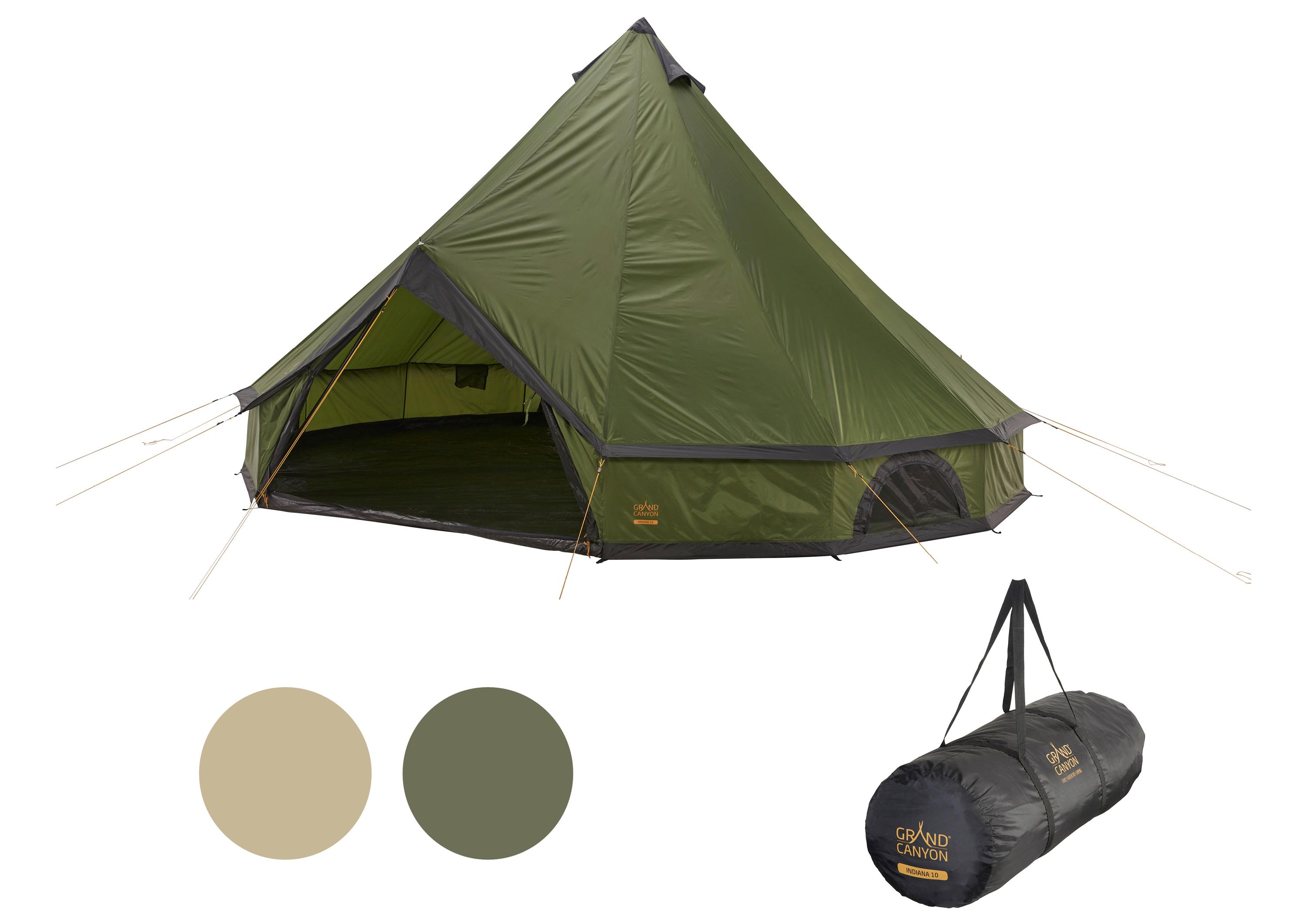 Die größere Variante von INDIANA 8, ist INDIANA 10, es präsentiert sich als ein klassisches Rundzelt mit senkrechter Mittelstange und einem vormontierten A-Rahmen zur Unterstützung des großzügigen Zelteingangs. Es bietet Schlafmöglichkeiten für bis zu 10 Personen oder ausreichend Platz als zentraler Treffpunkt für größere Gruppen tagsüber. Die integrierte Bodenwanne schützt vor Insekten und gewährleistet ein unkompliziertes Aufstellen des Zeltes. Die groß dimensionierten Belüftungsöffnungen mit Abdeckung und die Moskitonetze an der Außenhülle sorgen für eine ausgezeichnete Luftzirkulation und ein stets angenehmes Raumklima im Inneren des Zeltes. Maße (L/B/H): 500 x 500 x 300cm.