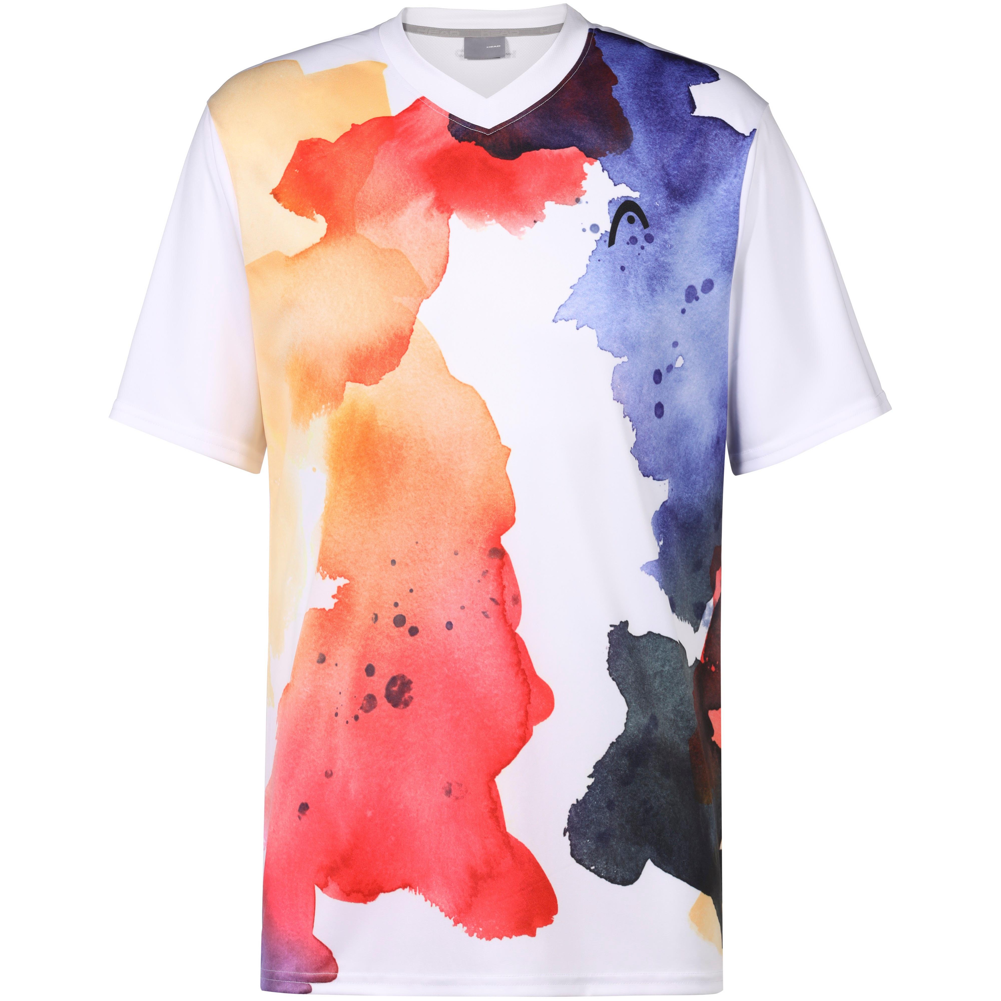 Tennisshirt mit buntem Watercolour-Print auf der Vorderseite; das Moisture Transfer Microfibre-Material leitet Feuchtigkeit ab und trocknet schnell; V-Ausschnitt; reguläre Passform mit kurzen Ärmeln; Material 100% Polyester.