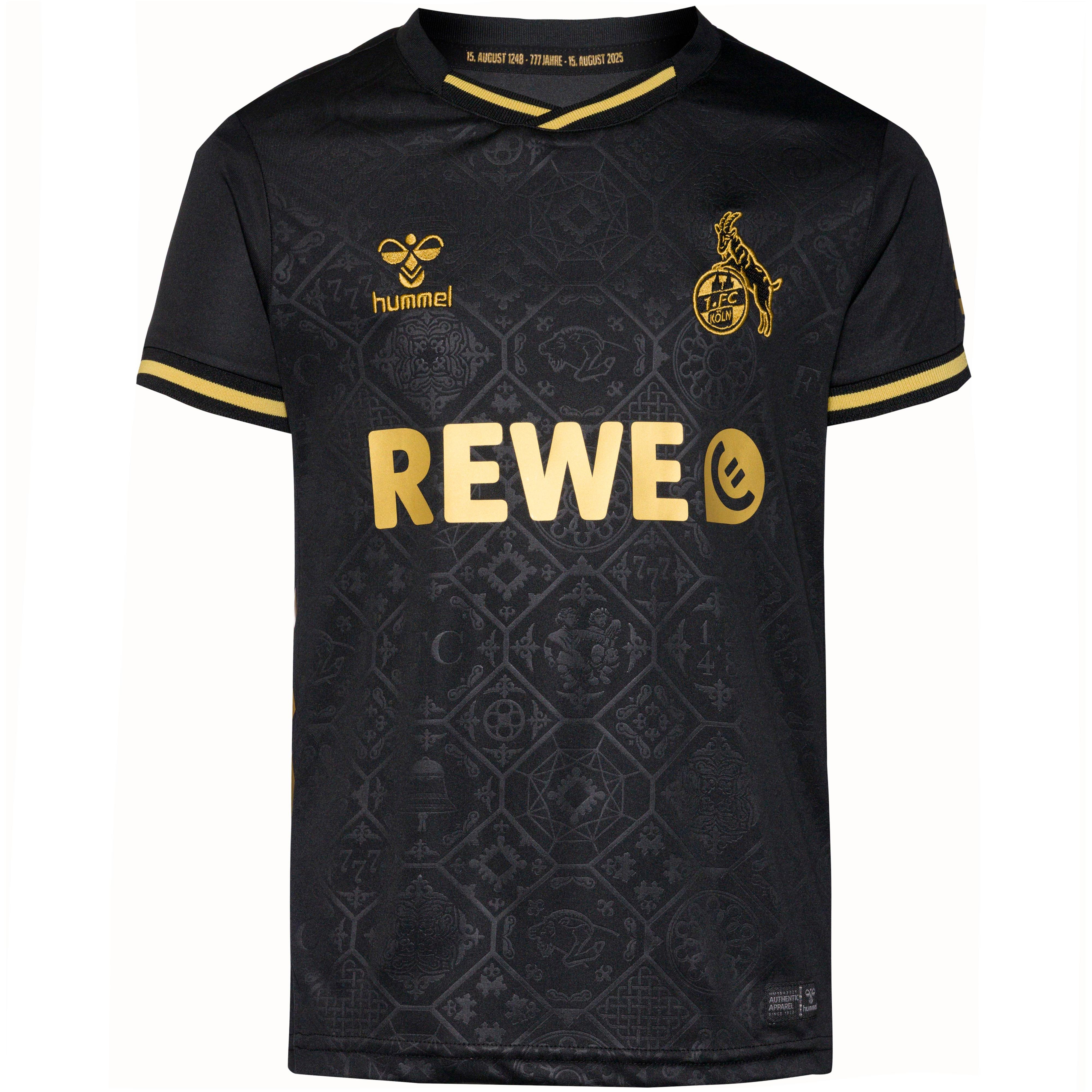 Kindertrikot des1. FC Köln im 777. Jubiläums-Design des Kölner Doms; Allover-Prägung mit architektonischen Details des Doms; V-Ausschnitt; Marken-, Sponsoren- und Vereinsdetails auf der Front; Material 100% Polyester (recycelt).