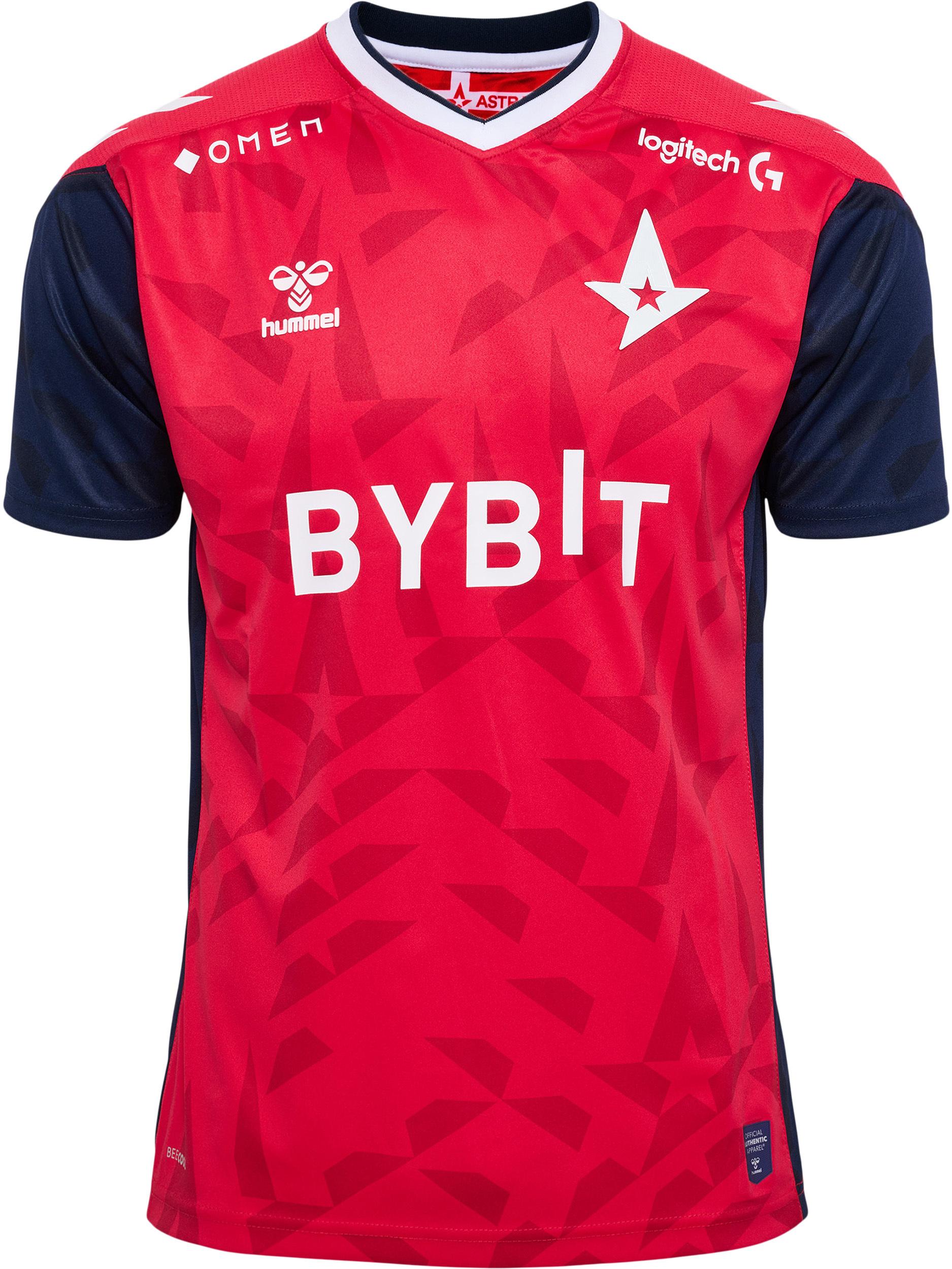 Das offizielle ASTRALIS 2022/2023 Spieltrikot. Mit aufgedruckten Chevrons auf den Schultern und Sponsorenlogos auf der Vorderseite. Das Trikot ist in den klassischen Farben Rot und Weiß gehalten und zeigt die dänische Flagge auf der Außenseite des Halses. Marineblaue Netzeinsätze an den Seiten, am Rücken und an den kurzen Ärmeln. ASTRALIS-Grafik am Nackenspiegel. ASTRALIS- und hummel-Logo auf der Brust.