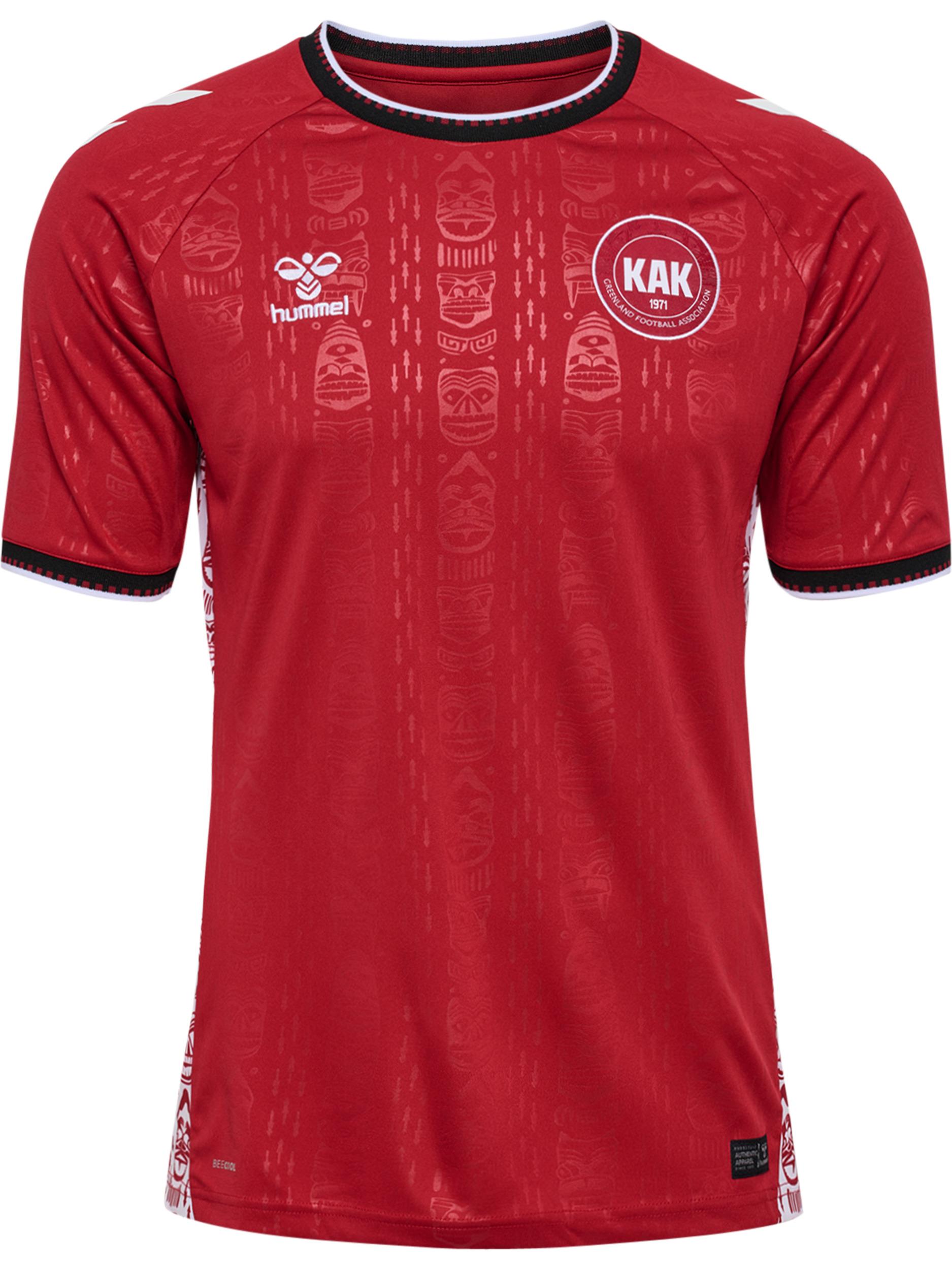 Grönlands Heimtrikot ist eine Hommage an das einzigartige kulturelle Erbe der Insel. Das Trikot zeigt ein eingraviertes Muster mit Tupilaks—kleine, kunstvoll geschnitzte Figuren aus der Inuit-Kultur. Zwischen diesen sind Tuukkaqer-Muster, die eine traditionelle männliche Speerspitze darstellen und gleichzeitig als Symbol für moderne Männlichkeit fungieren. Rippe und Kragen sind mit Avittatter-Mustern verziert, Elemente, die auch in Nationaltrachten und lokaler Kunst zu sehen sind. Dieses Design verwebt bedeutende kulturelle Motive mit der einzigartigen Geschichte und dem Geist des grönländischen Volkes.