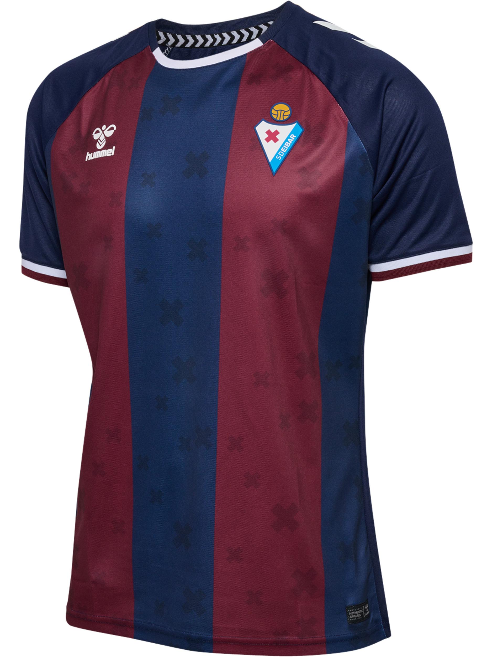 Das Heimtrikot 24/25 des spanischen Fußballvereins Sociedad Deportiva Eibar hat ein sublimiertes Streifenmuster in Blau und Rot auf der Vorder- und Rückseite. Zusätzlich ist ein grafisches Muster mit dem Eibar-Logo-Kreuz in den Stoff eingeprägt. Das hummel-Logo und das Vereinsabzeichen zieren die Brust, während an den Schultern und im Nackenband hummel-Winkelrillen zu sehen sind.