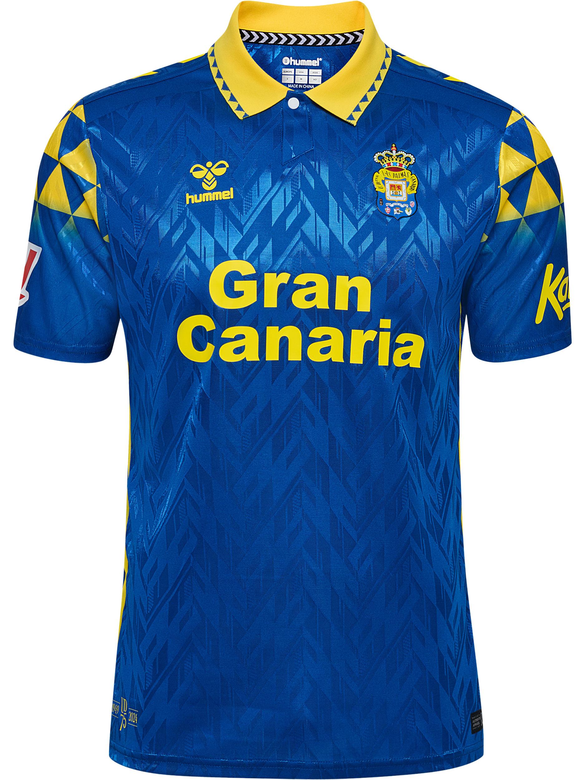 Das Auswärtstrikot von UD Las Palmas für die Saison 24/25 wurde mit Bezug auf die Geschichte Gran Canarias entworfen. Das Trikot hat eine tiefblaue Farbe mit gelben Seitenteilen, Kragen und Logodetails. Die Ärmel sind mit einem sublimierten grafischen Muster versehen, das von verschiedenen historischen Referenzen der Insel inspiriert ist, während die Schultern mit klassischen hummel Chevrons verziert sind. Der Kragen hat einen speziellen Retro-Look mit einem Knopfverschluss und einem grafischen Muster. Das Trikot besteht aus 100 % recyceltem Polyester und hat das Vereinslogo und das hummel-Logo auf der Brust.