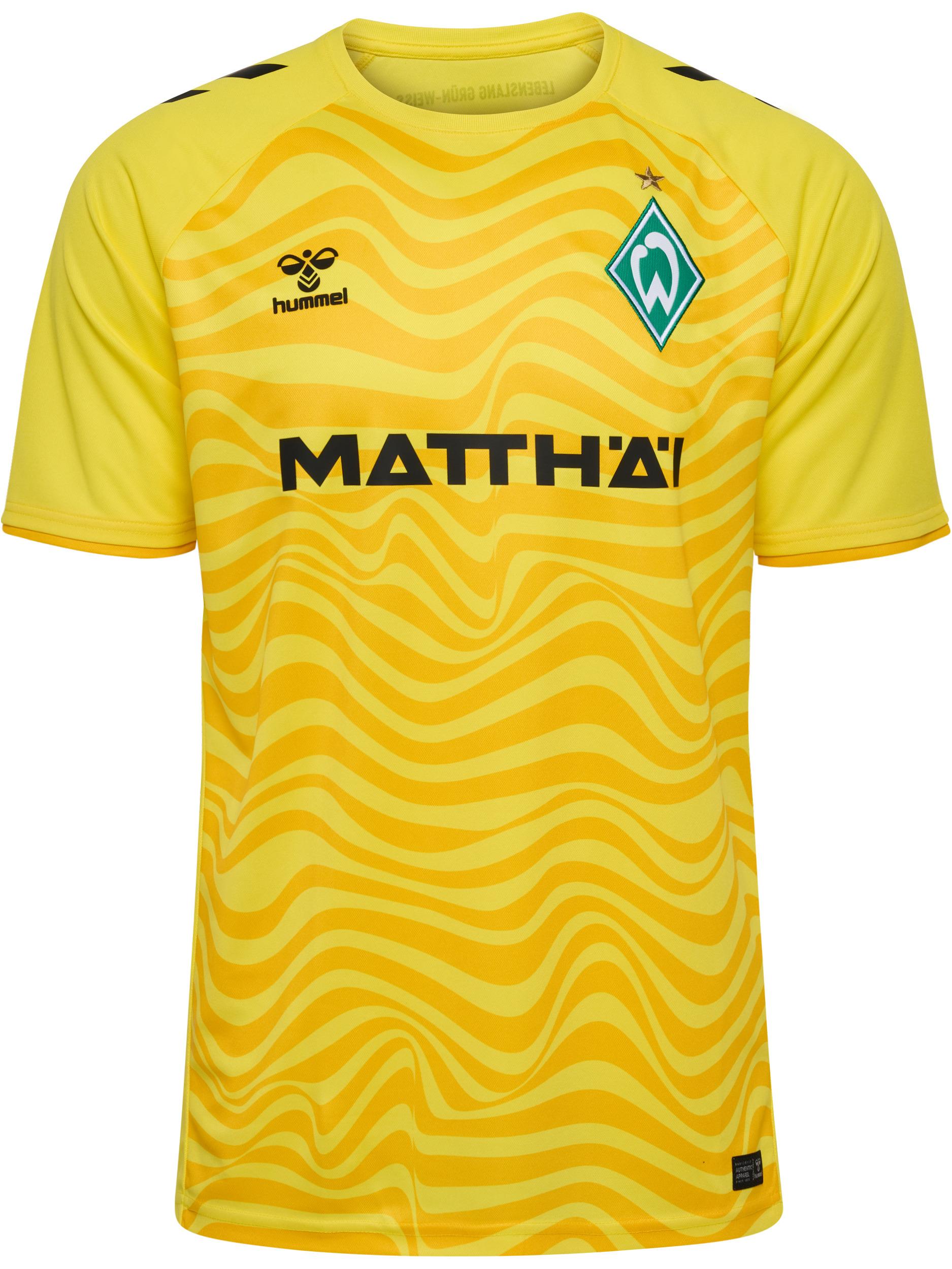 Werder Bremen 24/25 Torwarttrikot mit kurzen Ärmeln. Grafischer Wellen-Allover-Print auf der Vorderseite sowie hummel-Logo und Vereinslogo auf der Brust. hummel-Winkel auf den Schultern vervollständigen den Look.