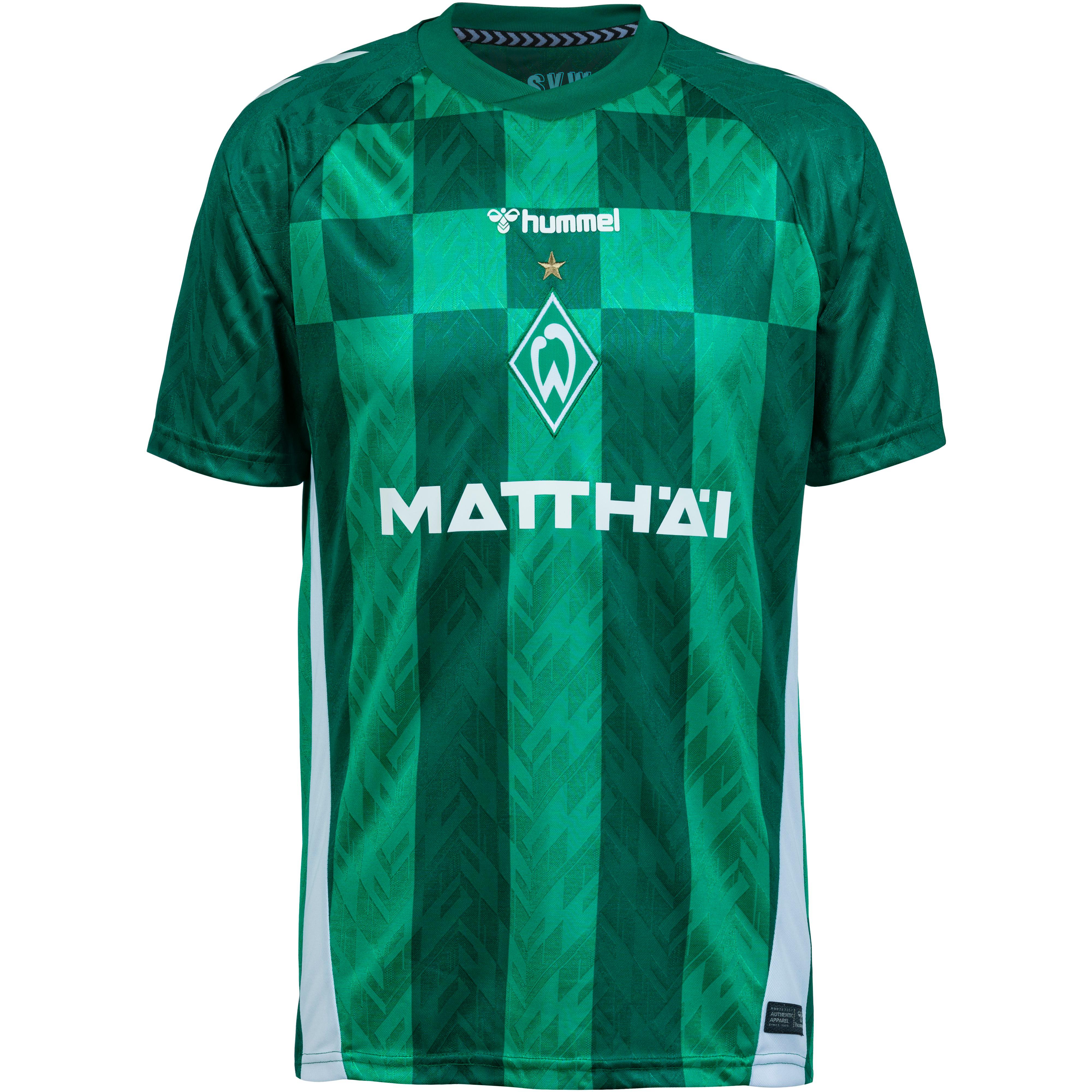 Fußballtrikot für Werder Bremen-Fans; Heimtrikot 2024/25; atmungsaktiv und schnelltrocknend dank BECOOL-Technologie; Allover-Print und Streifenmuster inspiriert von der Bremer Stadtflagge; gerippter Ausschnitt; Marken- und Vereinslogo auf der Brust; Schriftzug im Nacken; Material 100% Polyester (recycelt).