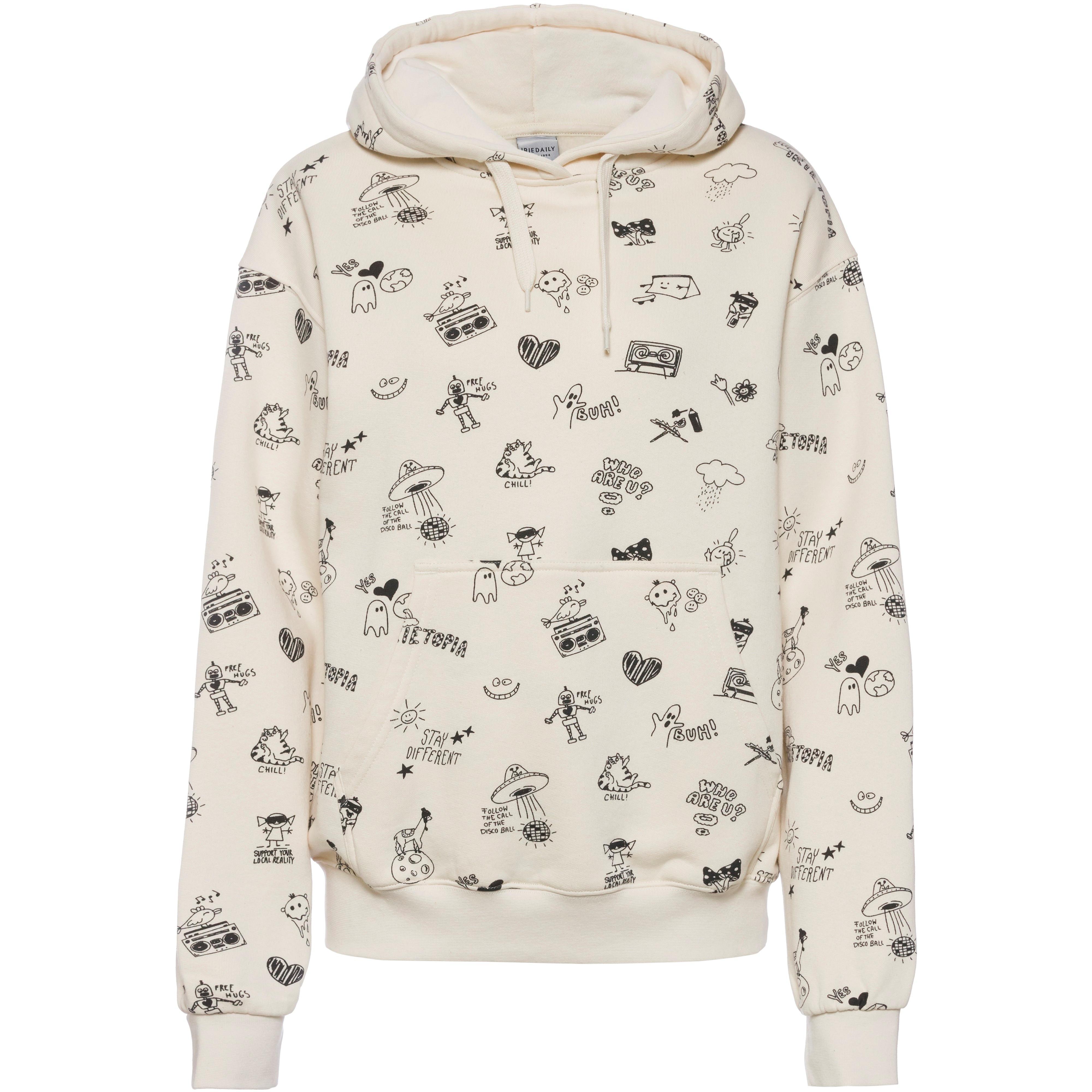 Veganer Hoodie mit stylishem Alloverprint; Kapuze mit flachem Kordelzug; Kängurutasche; Arm-und Saumabschluss flauschig, wärmende Innenseite; unter fairen Bedingungen gemäß der Fair Wear Foundation hergestellt; Made in Europe; Material 100% Baumwolle (Biobaumwolle).