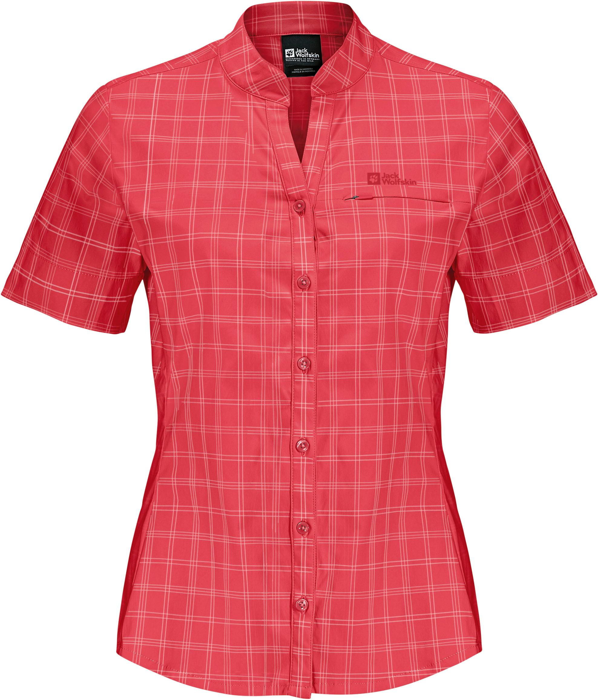 Kurzärmelige Funktionsbluse mit Karomuster; aus elastischem Texadri-Material; atmungsaktiv, feuchtigkeitsregulierend und schnelltrocknend; mit antibakterieller und geruchshemmender Microban®-Technologie; Stehkragen; durchgehende Knopfleiste; Brusttasche mit Reißverschluss; abgerundeter Saum; Material 95% Polyamid, 5% Elastan.