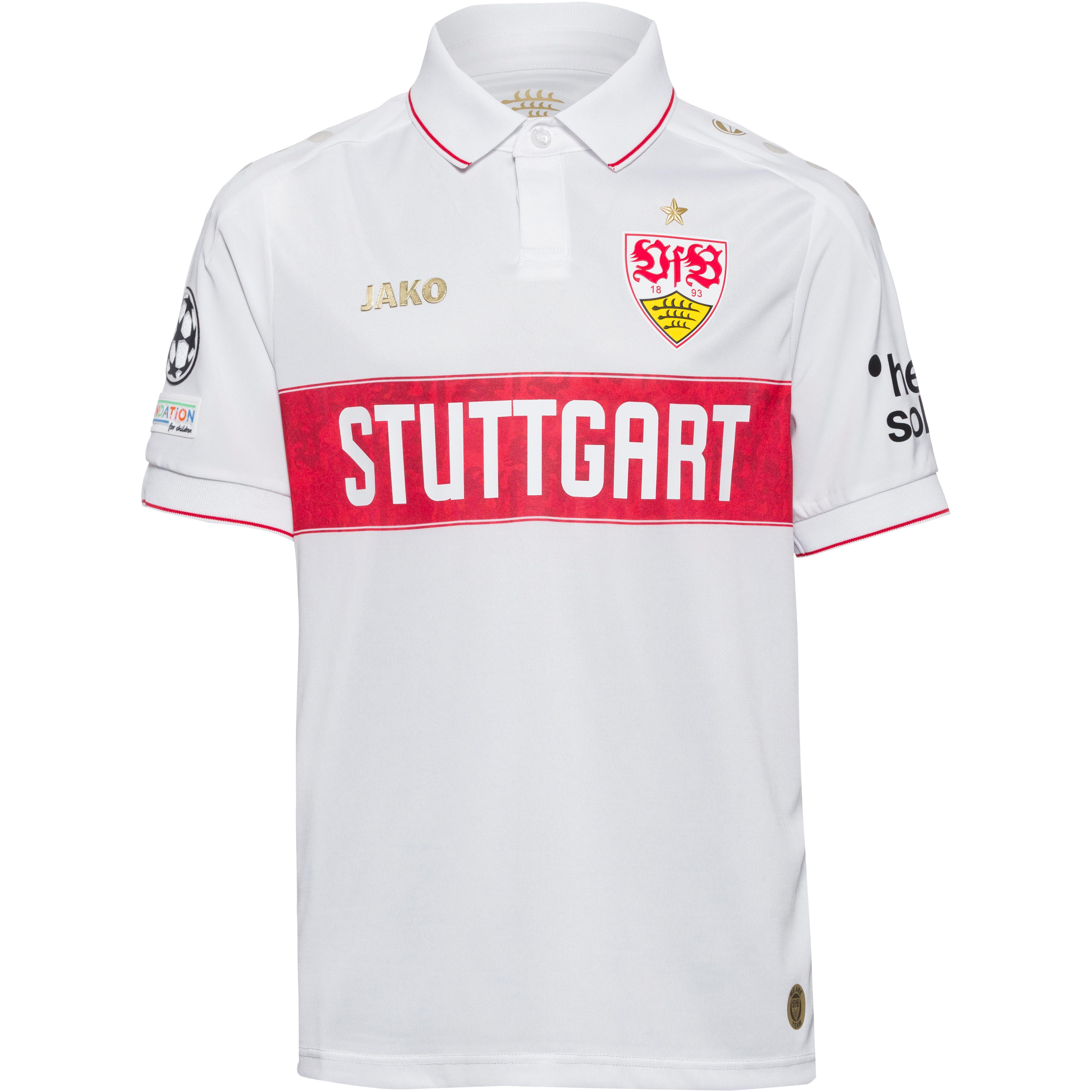 Kinder-Trikot des VfB Stuttgarts; semi-transparentes Gewebe mit Meshbereich im Rücken; Polokragen; die Halbraglanärmel sorgen für optimale Bewegungsfreiheit bei allen Aktivitäten; Marken-, Sponsoren- und Vereinsdetails auf der Front; Material I 100% Polyester (recycelt), Material II 82% Polyester (recycelt), 18% Elastan.