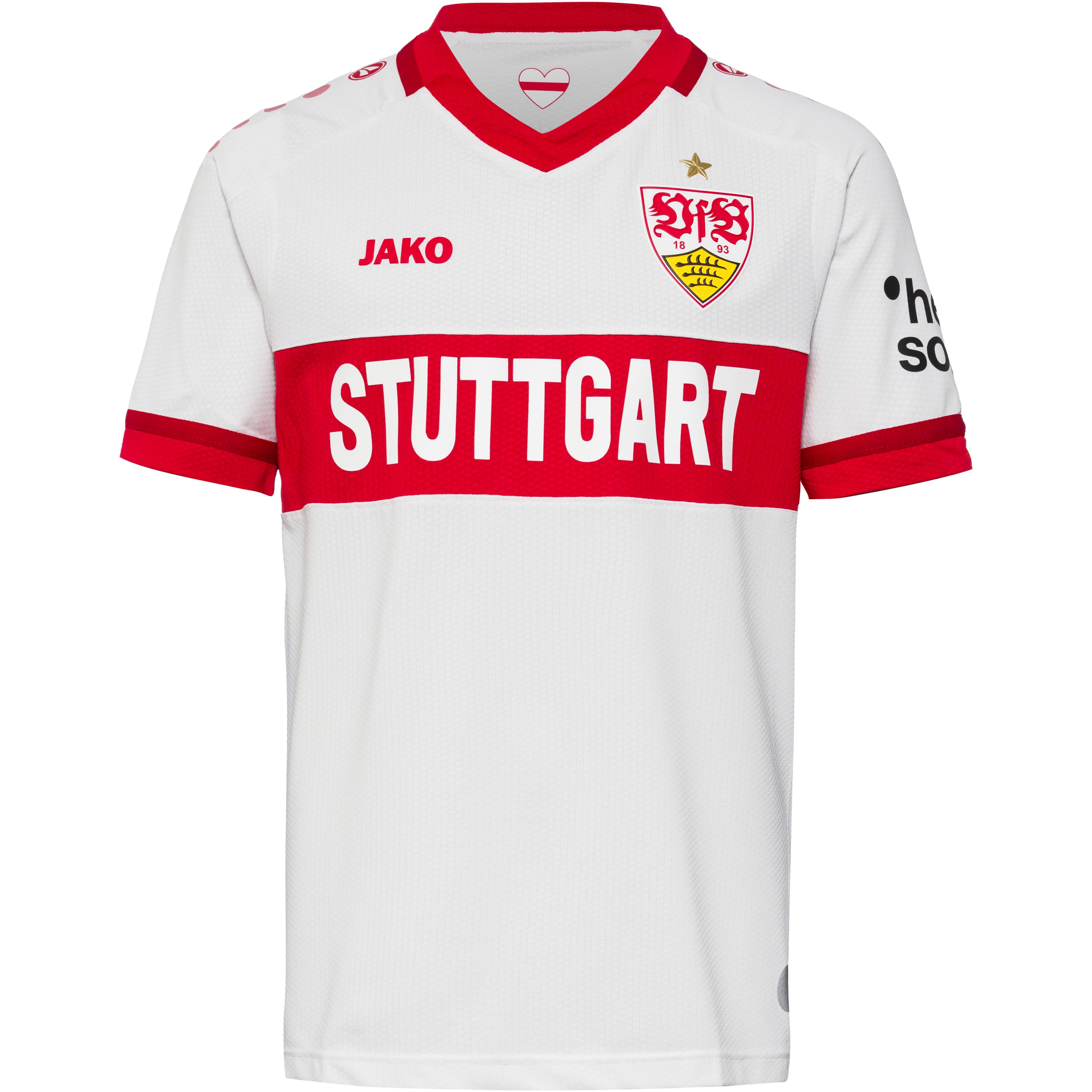 Heim-Trikot des VfB Stuttgarts, für die Saison 2024/25; V-Ausschnitt; die Raglanärmel sorgen für optimale Bewegungsfreiheit bei allen Aktivitäten; Marken-, Sponsoren- und Vereinsdetails auf der Front; Material 90% Polyester (recycelt), 10% Elastan.
