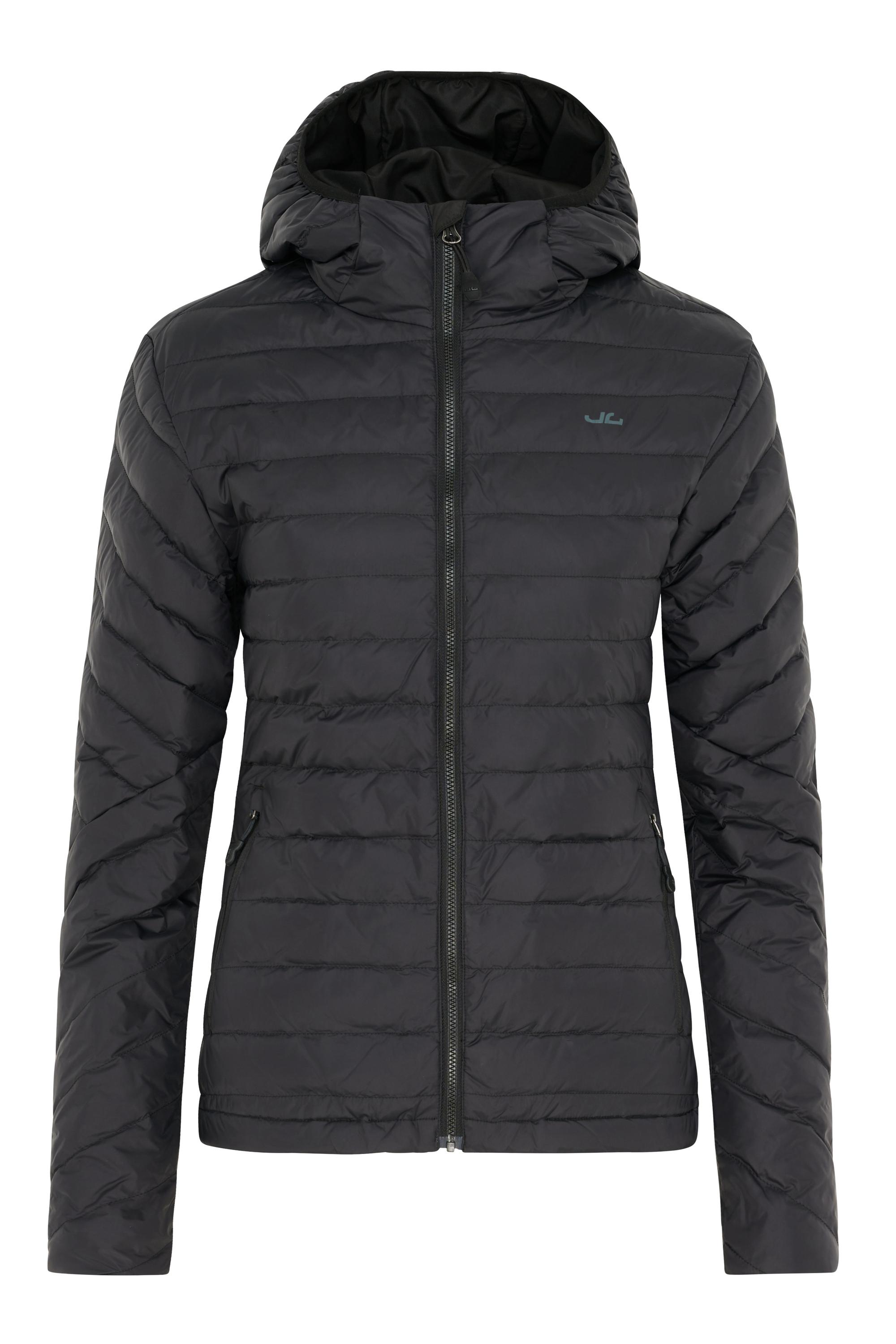 Mit unserer Damen Daunenjacke Aria bist du für alle Situationen gewappnet. Dank der Füllung aus hochwertiger europäischer Gänsedaune, die nicht per Lebendrupf gewonnen wurde, hält die Jacke trotz des geringen Gewichts sehr warm. Wir verwenden hier eine besonders hochwertige Mischung aus 90% Daunen und 10% Federn mit 800 cuin Bauschkraft, um absolut sicher zu gehen, dass dir nicht kalt wird! Der wasserabweisende Oberstoff aus Polyester hält, anders als bei vielen anderen, auch mal einen kurzen Regenschauer ab, ohne dass die Daunen verklumpen und ihre Isolierungseigenschaften verlieren. Zusammen mit der Anti-Flecken Ausrüstung ist die Aria Daunenjacke außerdem sehr pflegeleicht. Dank unserer Entwicklung im Bereich der Daunen können wir mit der Aria eine Jacke präsentieren, die nicht - wie sonst üblich bei Daunenjacken - groß aufträgt. Die Daunenkammern sind nur wenige Zentimeter dick und schmeicheln so ideal deiner Figur. Apropos Figur: Die Aria haben wir extra tailliert geschnitten. Die Passform ist eher kurz gehalten und zum Po leicht verlängert. Damit können auch kleinere Frauen ihre Proportionen ideal betonen. Stilistisch ist unsere Aria klassisch, aber Up to Date. Gesteppte Daunenkammern laufen parallel auf dem Bauch- und Rückenbereich, sowie den Armen. Im Schulterbereich haben unsere Designer das Ganze etwas aufgelockert und die Kammern im Karo Muster gestaltet. Die beiden, mit leicht aufgerautem Fleece ausgekleideten Handwärmertaschen sind mit hochwertigen YKK-Reißverschlüssen ausgestattet und bilden mit ihren farblichen Akzenten einen schönen Kontrast. Für den einfachen Zug sorgen unsere Jeff Green Zipper Puller. Der große YKK-Reißverschluss ist mittig angebracht und verschließt den Halsbereich mit einem Kinnschutz. Für die besondere Wärme sorgen die ausklappbaren Armstulpen, so hat Zugluft ganz sicher keine Chance mehr.