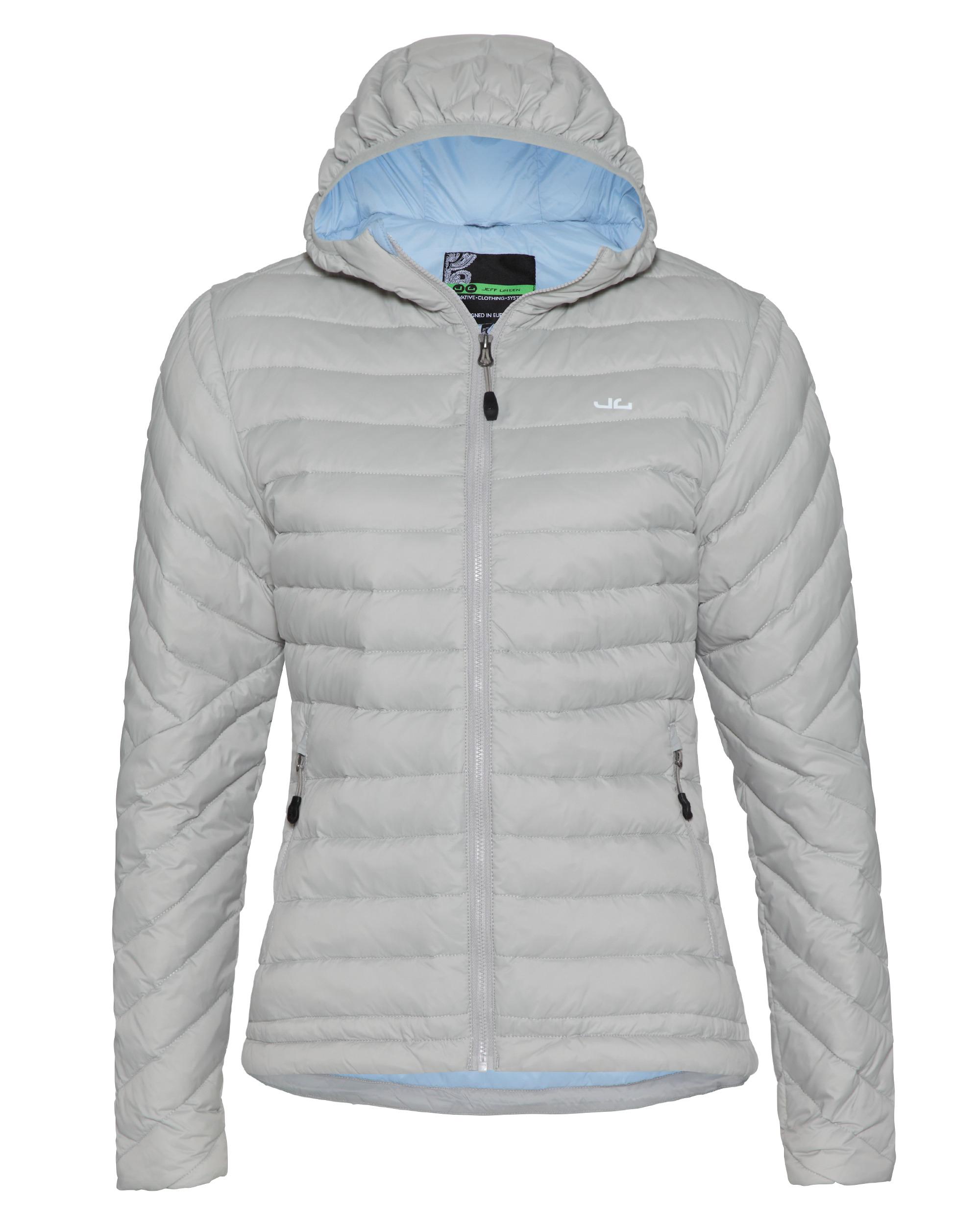Mit unserer Damen Daunenjacke Aria bist du für alle Situationen gewappnet. Dank der Füllung aus hochwertiger europäischer Gänsedaune, die nicht per Lebendrupf gewonnen wurde, hält die Jacke trotz des geringen Gewichts sehr warm. Wir verwenden hier eine besonders hochwertige Mischung aus 90% Daunen und 10% Federn mit 800 cuin Bauschkraft, um absolut sicher zu gehen, dass dir nicht kalt wird! Der wasserabweisende Oberstoff aus Polyester hält, anders als bei vielen anderen, auch mal einen kurzen Regenschauer ab, ohne dass die Daunen verklumpen und ihre Isolierungseigenschaften verlieren. Zusammen mit der Anti-Flecken Ausrüstung ist die Aria Daunenjacke außerdem sehr pflegeleicht. Dank unserer Entwicklung im Bereich der Daunen können wir mit der Aria eine Jacke präsentieren, die nicht - wie sonst üblich bei Daunenjacken - groß aufträgt. Die Daunenkammern sind nur wenige Zentimeter dick und schmeicheln so ideal deiner Figur. Apropos Figur: Die Aria haben wir extra tailliert geschnitten. Die Passform ist eher kurz gehalten und zum Po leicht verlängert. Damit können auch kleinere Frauen ihre Proportionen ideal betonen. Stilistisch ist unsere Aria klassisch, aber Up to Date. Gesteppte Daunenkammern laufen parallel auf dem Bauch- und Rückenbereich, sowie den Armen. Im Schulterbereich haben unsere Designer das Ganze etwas aufgelockert und die Kammern im Karo Muster gestaltet. Die beiden, mit leicht aufgerautem Fleece ausgekleideten Handwärmertaschen sind mit hochwertigen YKK-Reißverschlüssen ausgestattet und bilden mit ihren farblichen Akzenten einen schönen Kontrast. Für den einfachen Zug sorgen unsere Jeff Green Zipper Puller. Der große YKK-Reißverschluss ist mittig angebracht und verschließt den Halsbereich mit einem Kinnschutz. Für die besondere Wärme sorgen die ausklappbaren Armstulpen, so hat Zugluft ganz sicher keine Chance mehr.