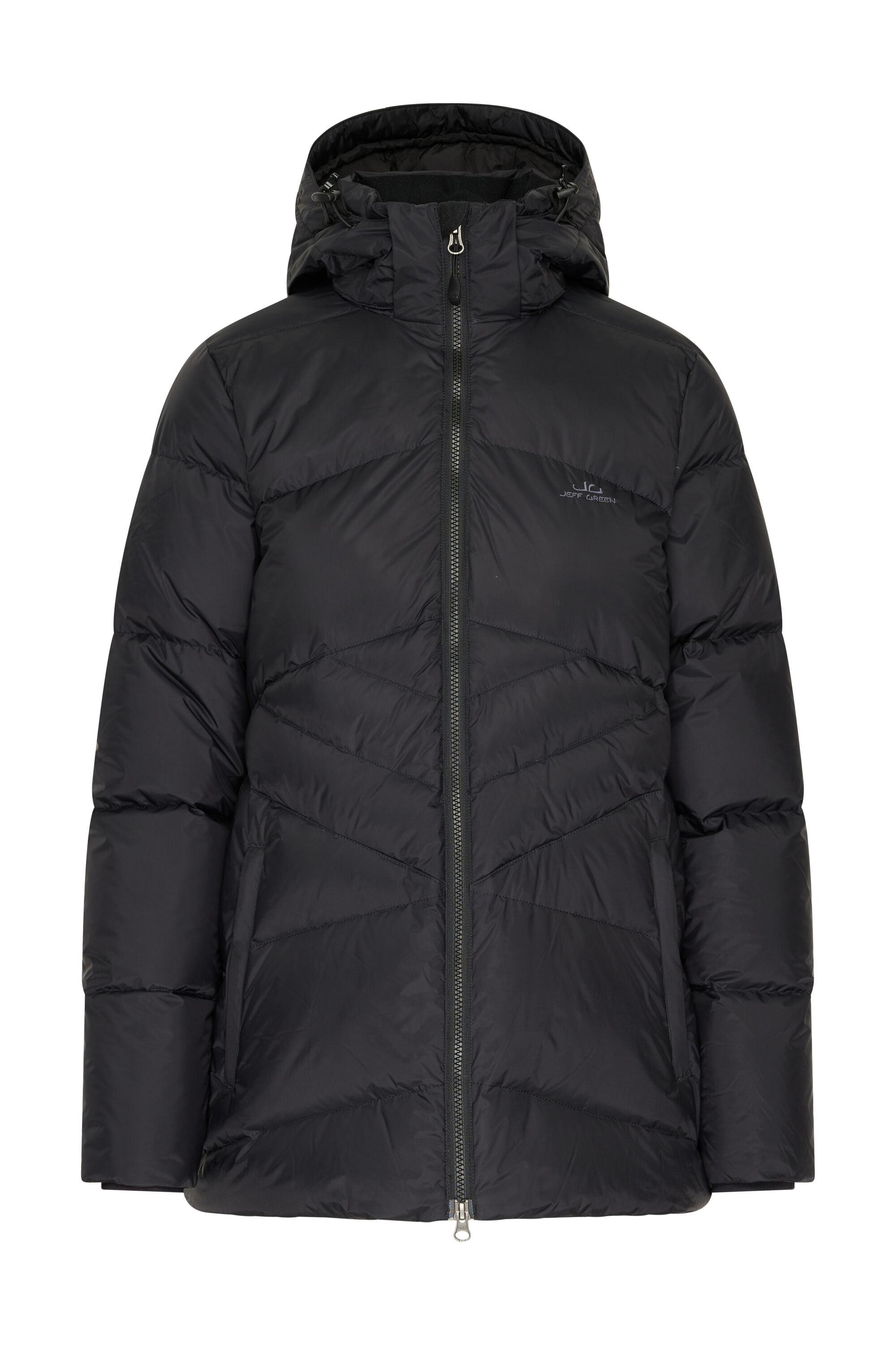 Der Daunenparka Eva vereint mühelos Eleganz mit außergewöhnlicher Funktionalität und begleitet Sie stilvoll durch jede Jahreszeit. Elegante A-Linien Passform für zeitlose Schönheit Der Daunenparka Eva besticht durch seine A-Linien Passform, die nicht nur eine elegante Silhouette schafft, sondern auch Bewegungsfreiheit gewährt. Ganz gleich, ob Sie in der Stadt flanieren oder die Natur erkunden - dieser Parka betont Ihre Schönheit auf dezente Weise. Schutz vor den Elementen in höchster Qualität Mit einem dauerhaft wasserabweisenden und winddichten Außenstoff trotzt der Parka Eva den Witterungseinflüssen. Komfort und Wärme bis ins Detail Der hochschließende Kragen ist mit gebürstetem Fleece ausgekleidet und bietet zusätzliche Wärme und Schutz vor kaltem Wind. Der YKK Vislon 2-Wege-Reißverschluss mit Untertritt und Kinnschutz gewährleistet mühelose Anpassung und verhindert Reibung. Die beiden Reißverschlusstaschen sind mit gebürstetem Fleece ausgekleidet und wärmen nicht nur Ihre Hände, sondern bieten auch Platz für kleine Essentials. Die Innentasche mit Reißverschluss ist perfekt für Wertsachen. Anpassungsfähigkeit für jedes Wetter Die abnehmbare und voll einstellbare Kapuze ist der ideale Begleiter für unterschiedlichste Wetterbedingungen. Der über Quickstopper einstellbare Bund ermöglicht eine individuelle Anpassung an Ihre Bedürfnisse. Die Ärmelbündchen mit innenliegender Stulpe und Daumenloch bieten zusätzliche Wärme und Schutz. Hochwertige Materialien und ethische Füllung Der Daunenparka Eva besteht aus hochwertigem Außengewebe aus 100% Polyamid, einem Futter aus 100% Polyester und einer Isolierung aus 80% Daunen und 20% Federn mit einer Bauschkraft von 750 CUIN. Die Füllung stammt aus ethisch vertretbaren Quellen ohne Lebendrupf. Mit einem Gewicht von 750 g (Größe 38) hält der Parka Sie warm, ohne aufzutragen. Der Daunenparka Eva vereint Stil und Funktionalität in einer einzigartigen Weise. Ganz gleich, ob Sie durch die Stadt schlendern oder sich in der Natur aufhalten, dieser Parka bietet Ihnen Wärme, Schutz und zeitlose Eleganz. Bitte beachten Sie, dass der Parka nichttextile Teile tierischen Ursprungs enthält.