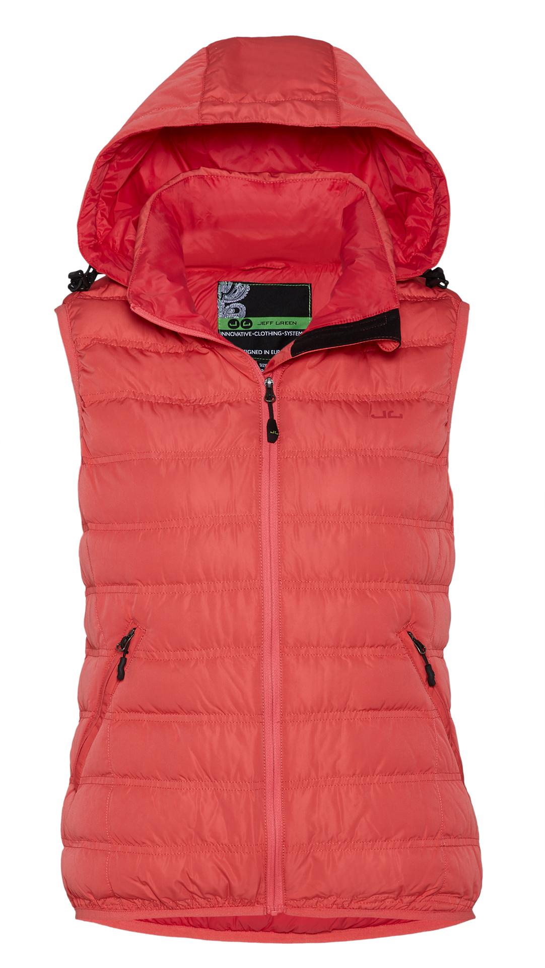 Jeff Green ist ein Unternehmen aus Norddeutschland, das hochwertige funktionale Outdoor Bekleidung herstellt. Entwicklung & Design in Deutschland! Federleicht, superwarm und immer dabei! Unsere Daunenweste Madlin wird Dich mit ihrer hochwertigen zertifizierten Gänsedaune, dem geringen Packmaß (Transportbeutel inklusive) und dem federleichten Gewicht von gerade mal 300 Gramm (Gr. 40) begeistern. Wir verwenden eine besonders hochwertige Mischung aus 80% Daunen, die nicht per Lebendrupf gewonnen werden und 20% Federn mit einer Bauschkraft von 750 cuin. Der wasserabweisende Oberstoff schützt Dich bei leichten Regenschauern und hält gleichzeitig die Daunen im Inneren trocken - die Daunen verklumpen nicht und die hervorragende natürliche Isolationseigenschaft der Daunen bleibt erhalten. Mit einer abnehmbaren und über Quickstopper einstellbaren Kapuze sowie einer RV-Innentasche bietet unsere Daunenweste Madlin alles, was Du Dir von einer hochwertigen Daunenweste wünschst. Produktmerkmale:: - Hochwertige 80/20 Mischung, 750 cuin - 2 Reißverschluss-Außentaschen - Innen eine Reißverschluss-Tasche mit Multimedia-Kabelführung - Elastikband an Saum und Armloch - Abnehmbare Kapuze mit Quickstopper - Wasserabweisend - Leichtgewichtiges Material - Daunendicht - Inklusive Transportbeutel für besonders platzsparende Verstauung - Enthält nichttextile Teile tierischen Ursprungs.