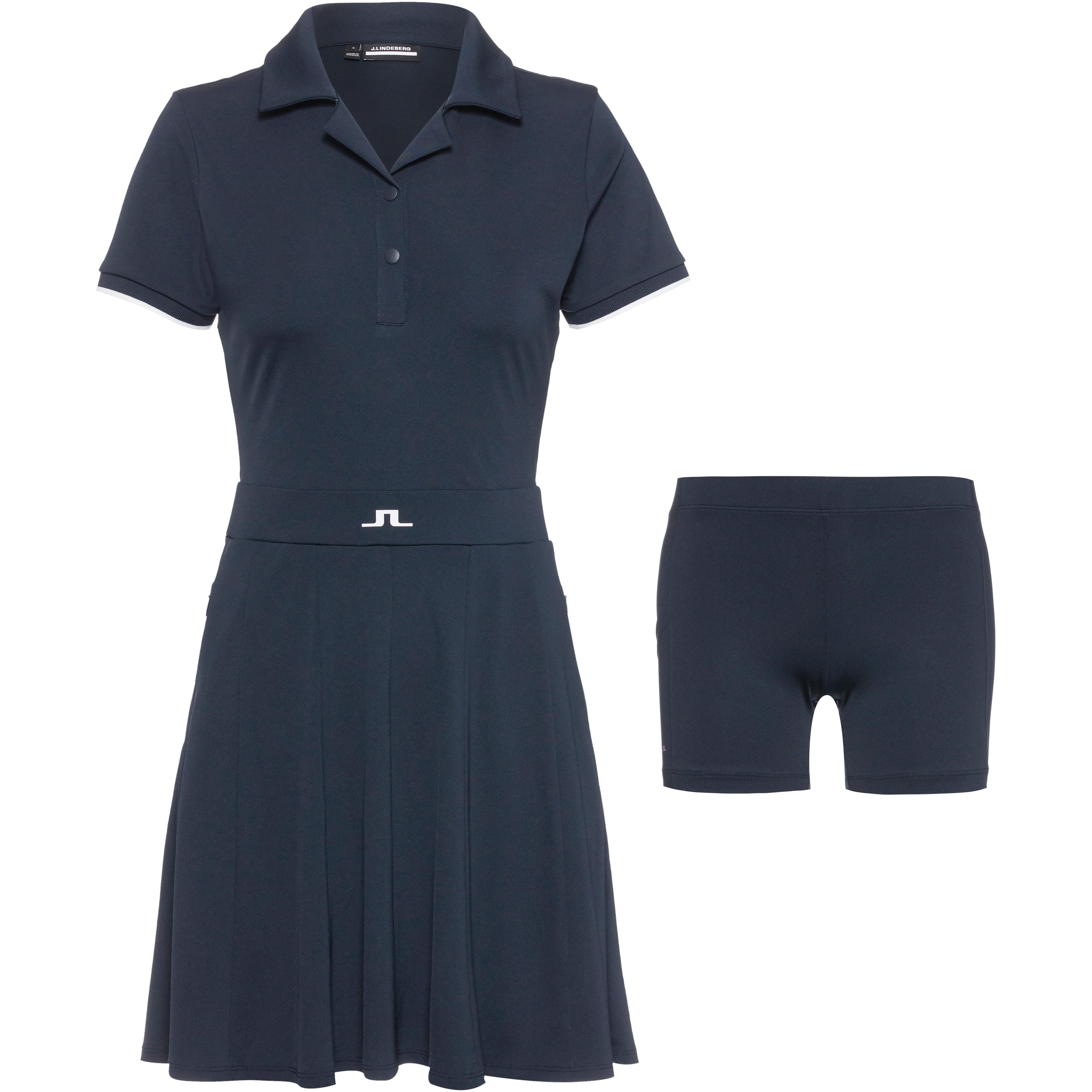 Kurzärmeliges Golfkleid im sportiven Retro-Look, inklusive kurze Tights; feuchtigkeitsregulierend und schnelltrocknend dank TXJersey™; 4-Wege-Stretch; Hemdblusenkragen mit 2 Druckknöpfen; Armabschlüsse mit Rippbündchen; Taillierung durch Gummibund mit Logoprint auf der Front; Kleidbereich unterhalb der Taille mit Faltenwurf und leichter A-Linie; 2 seitliche Reißverschlusstaschen; Innenhose in körpernaher Passform, mit Beintasche; Rückenlänge: ca. 88 cm/Gr. S; Material I 100% Polyester, Material II 92% Polyester, 8% Elastan.