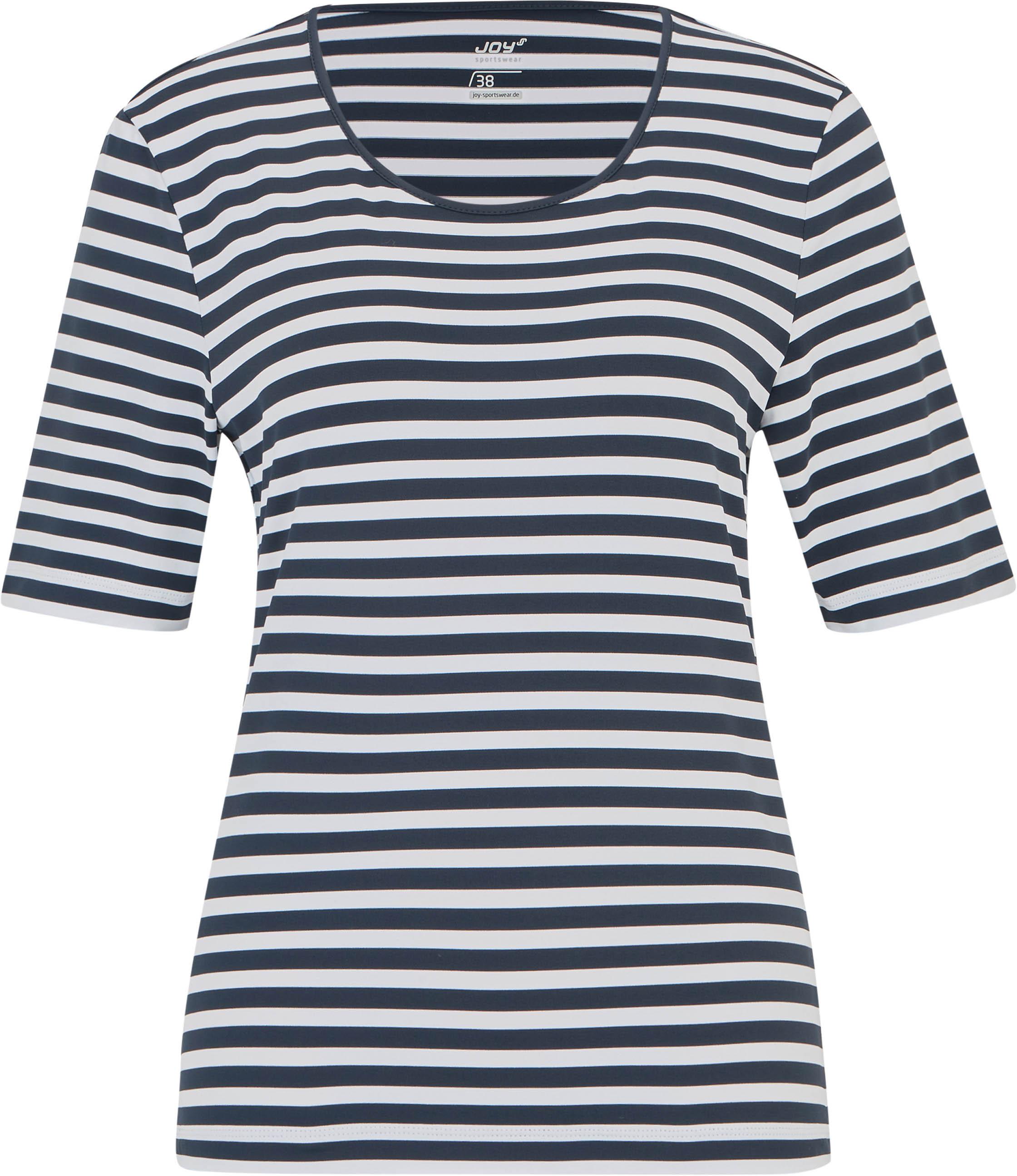 Gestreiftes T-Shirt mit klimaregulierenden Eigeschaften; tiefer Rundhalsausschnitt; halblange Ärmel; körpernaher, leicht taillierter Schnitt; Material 93% Polyamid, 7% Elastan.