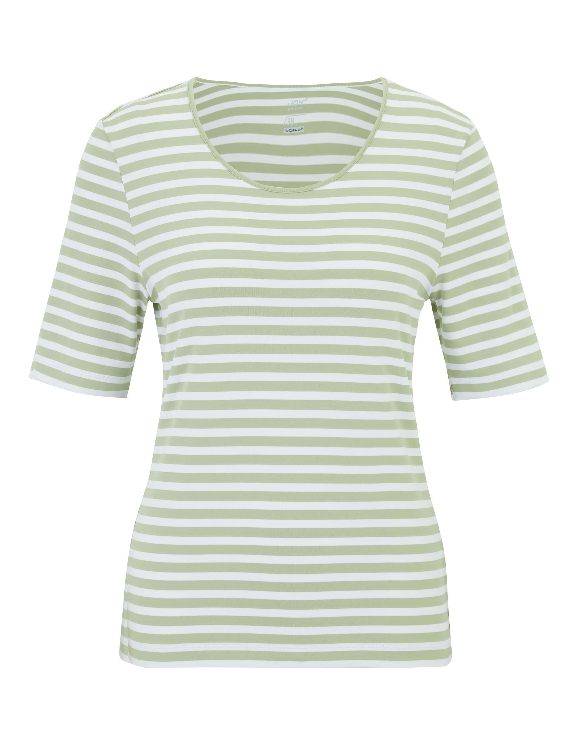 Das T-Shirt ALLISON von JOY sportswear. Ob für zu Hause, im Garten oder auf der Straße, das Streifen-Shirt lässt sich passend kombinieren. Es hat einen etwas tieferen Rundhalsausschnitt und einen körpernahen Schnitt. Der verlängerte Kurzarm sieht nicht nur gut aus, er ist auch perfekt, wenn das Wetter mal frischer wird. Das weiche Baumwollmaterial verfügt über natürlich klimaregulierende Eigenschaften.