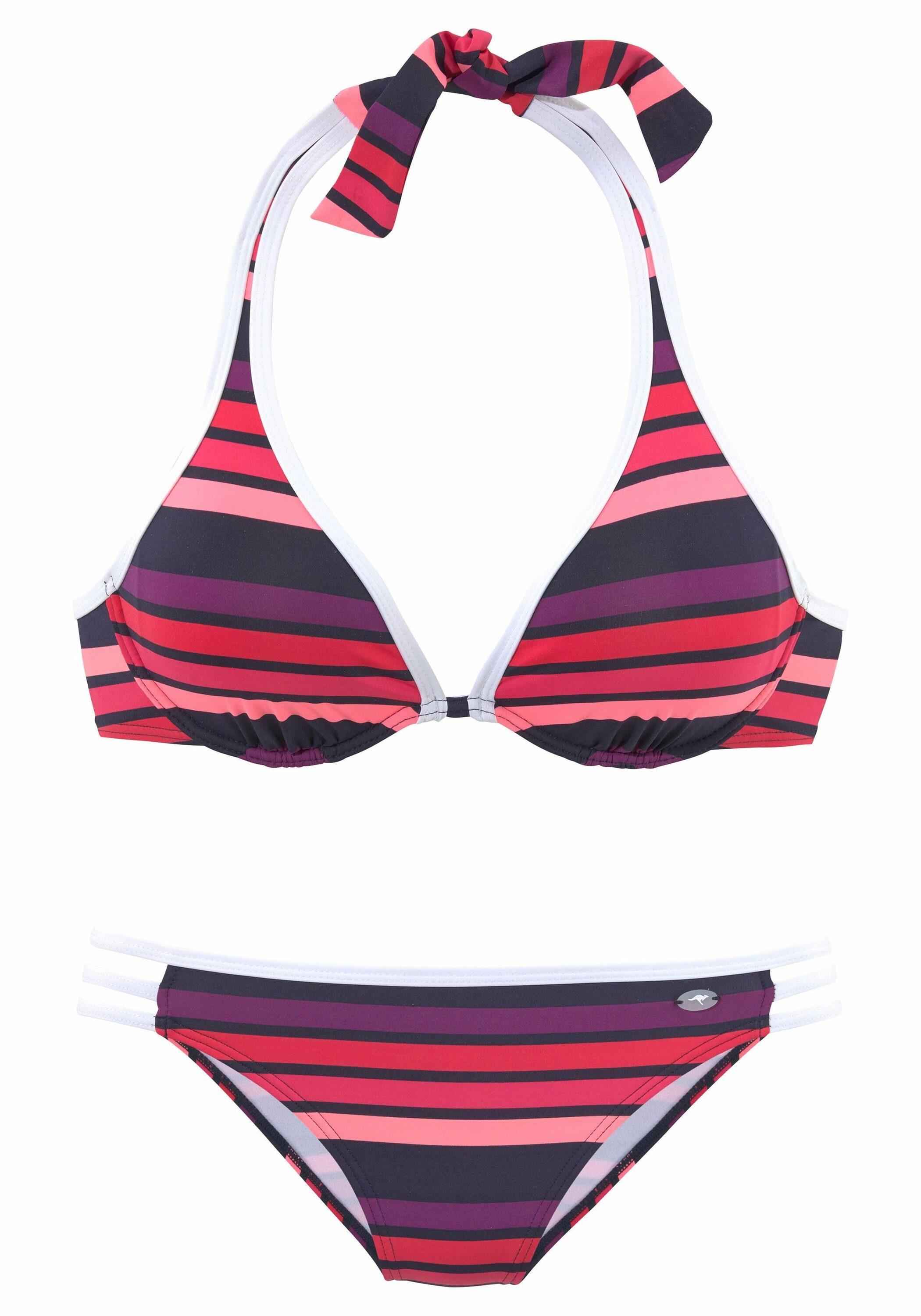 Gestreifter Bügelbikini von Kangaroos. Bequem im Nacken zu binden und im Rücken zu schließen. Herausnehmbare Cups. Hose mit schmalen Seitenbändern. Aus weicher Microfaser.