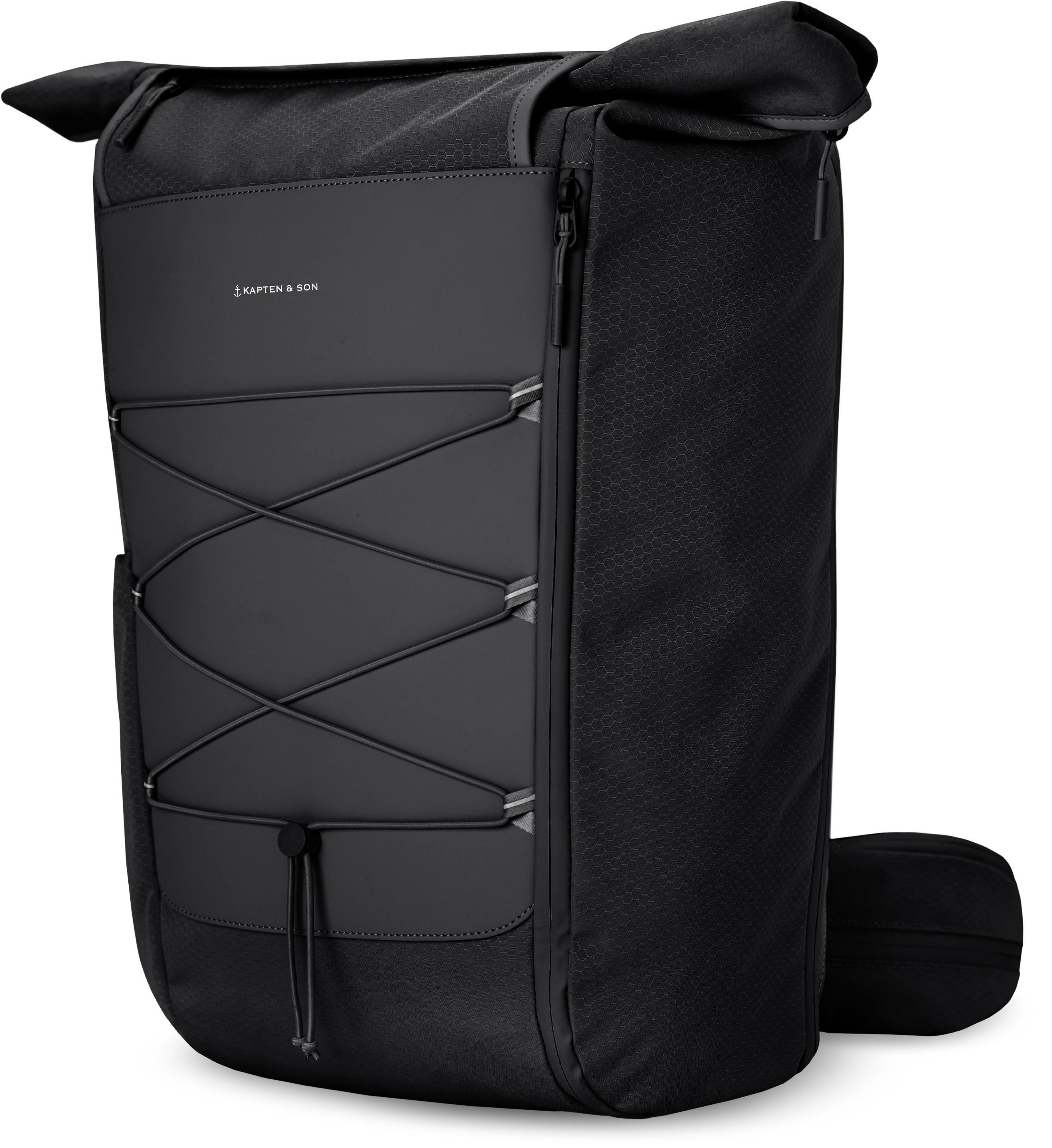Reiserucksack inklusive Kofferbefestigung; aus strapazierfähigem und wetterfestem Mix aus veganem Tech-Material, Recyclingmaterial und Ripstop; geräumiges Hauptfach, welcher sich dank der komplett aufklappbaren Rückseite leicht Be- und Entladen lässt; Rolltop-Verschluss; das elastische Band mit Stopper auf der Front sorgt für noch mehr Stauraum, indem Jacken, Pullover oder Ähnliches damit transportiert werden kann wenn diese nicht gebraucht werden; Laptopfach (Maße: ca. 39 x 30 x 3 cm); 2 zusätzliche Innentaschen mit Reißverschlüssen; separates Seitenfach, ideal für Schuhe und nasse Kleidung, inklusive extra Beutel; seitliche Flaschenhalterung mit elastischer Kordel; Quick Access Fronttasche; versteckte Tasche inklusive Regenschutz; gepolsterter Kontaktrücken mit Brust- und Hüftgurt; abnehmbarer Hüftgurt, welcher auch als Sling Bag getragen werden kann; reflektierende Elemente; erweiterbares Volumen: ca. 28 bis 35 Liter; Maße (H/B/T): ca. 63 x 45 x 18 cm.