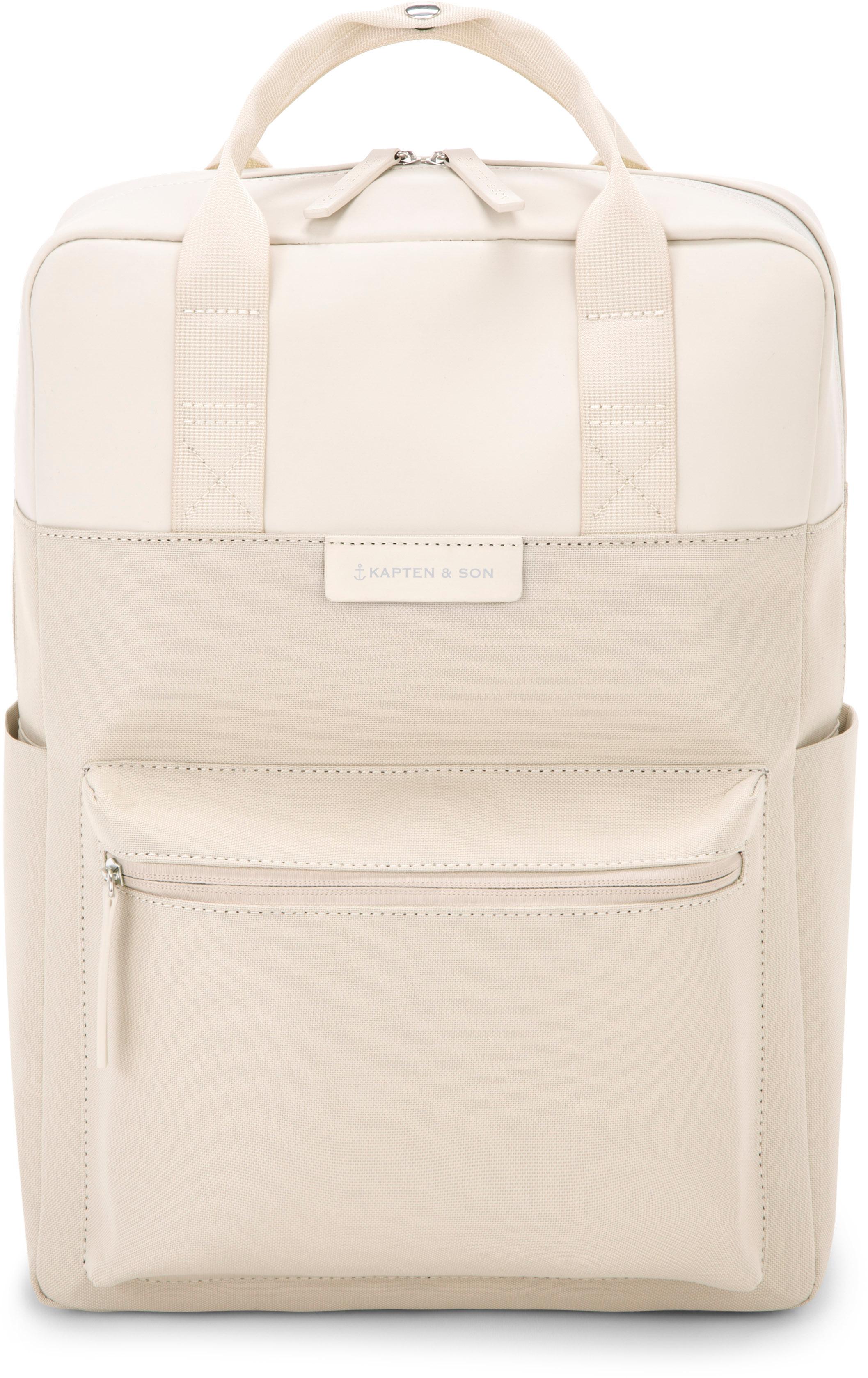 Vielseitiger, moderner Tagesrucksack aus glattem Kunstleder und strapazierfähigem Textil; gepolstertes 11 Zoll-Laptopfach (Maße: ca. 32 x 22 x 2,5 cm) und 1 weiteres Reißverschluss-Innenfach; 1 Außenfach mit Reißverschluss; 2 Steckfächer an den Seiten; verstellbare Schultergurte; 2 Tragehenkel mit Druckknopfverschluss; wasserabweisender Materialmix aus veganem Tech-Material und recyceltem PET; Volumen: 9 l; Maße (H/B/T): ca. 33,5 x 23,5 x 9,5 cm.