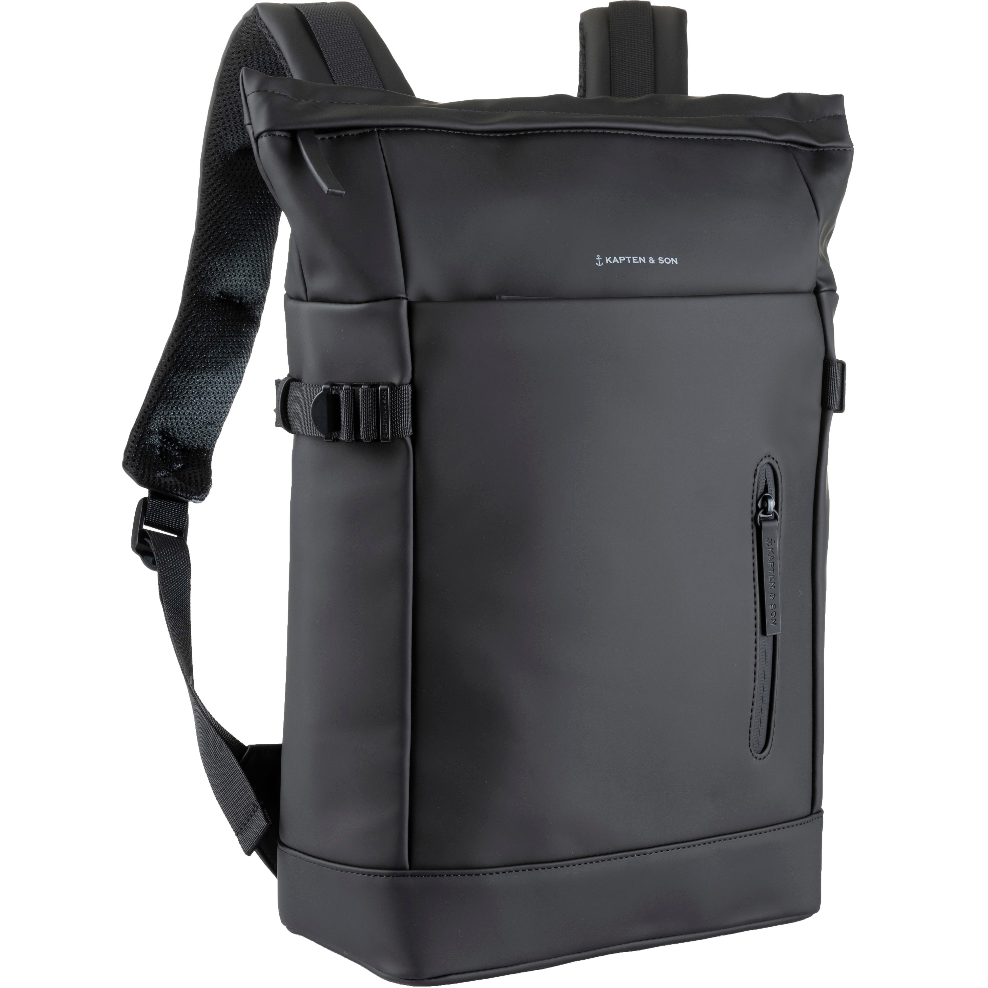 Daypack in Toploader-Form mit Reißverschluss; wasserabweisendes Tech-Außenmaterial; Innenmaterial aus recyceltem PET; Rücken und Schulterträger gepolstert; Halterung am Rücken zum Fixieren am Koffer; geräumiges Hauptfach mit gefütterten Innentaschen, einem Laptopfach (ca. 35 x 25 cm) und einer Flaschenhalterung; Reißverschlussöffnung am Rücken mit Zugang zum Laptopfach; großes, flaches Frontfach und eine kleine Reißverschluss-Fronttasche; Reißverschlussfach seitlich auf der Rückseite; seitliche Kompressionsriemen; Volumen: 16 l; Maße (H/B/T): ca. 46 x 26,5 x 14 cm; Gewicht: ca. 1,12 kg; vegan hergestellt.
