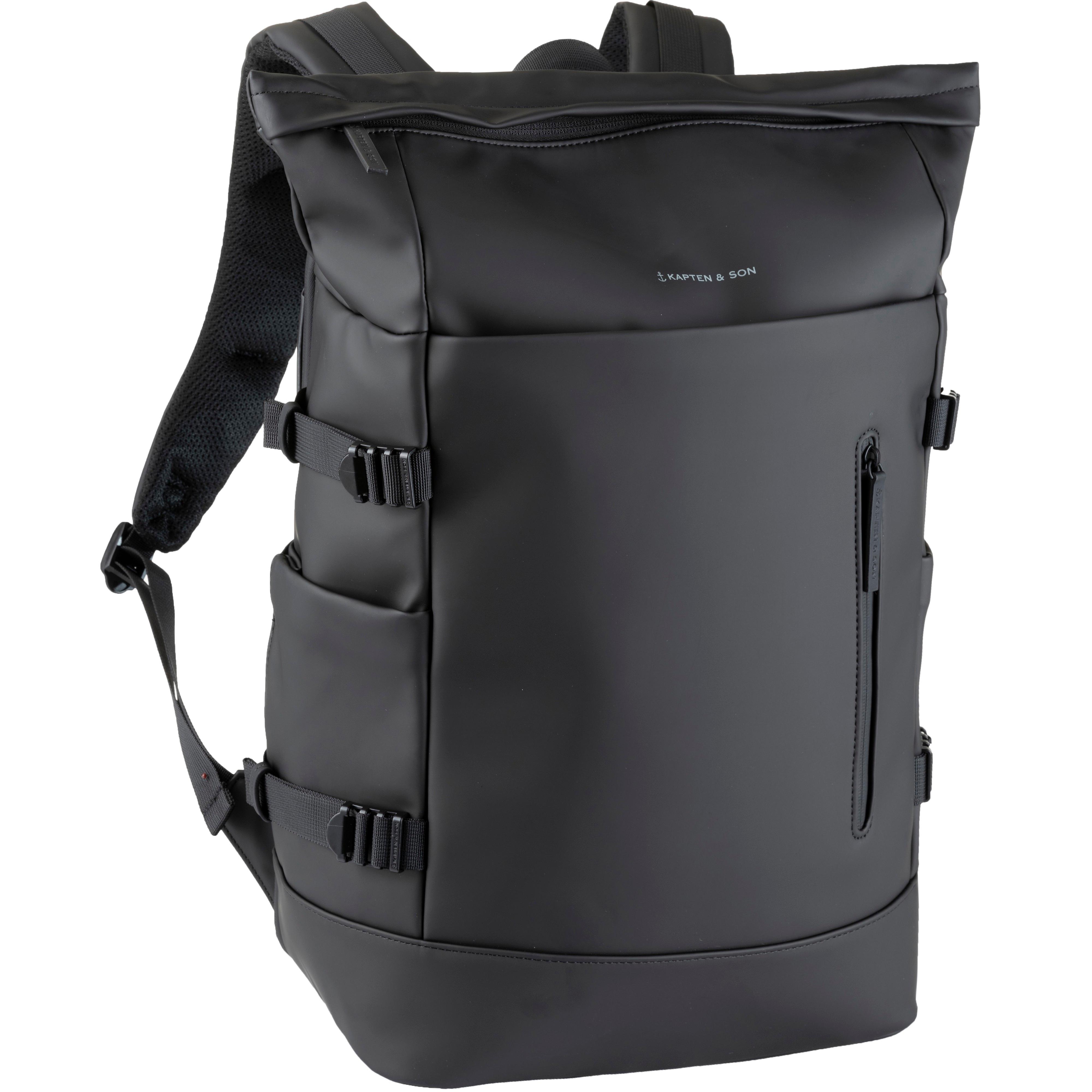 Großer Toploader-Daypack mit Reißverschluss; wasserabweisendes Tech-Außenmaterial; Innenmaterial aus recyceltem PET; Rücken und Schulterträger gepolstert; verstellbarer Brustgurt; Halterung am Rücken zum Fixieren am Koffer; geräumiges Hauptfach mit Organizer-Innentaschen und einem Laptopfach (ca. 31,5 x 28,5 cm); aufklappbare Rückseite für schnellen und einfachen Zugriff auf das Hauptfach; großes, flaches Frontfach und eine kleine Reißverschluss-Fronttasche; Reißverschlussfach seitlich auf der Rückseite; 2 Seitentaschen für z.B. Trinkflaschen; seitliche Kompressionsriemen; Volumen: 24 l; Maße (H/B/T): ca. 52 x 30 x 15,5 cm; Gewicht: ca. 1,2 kg; vegan hergestellt.