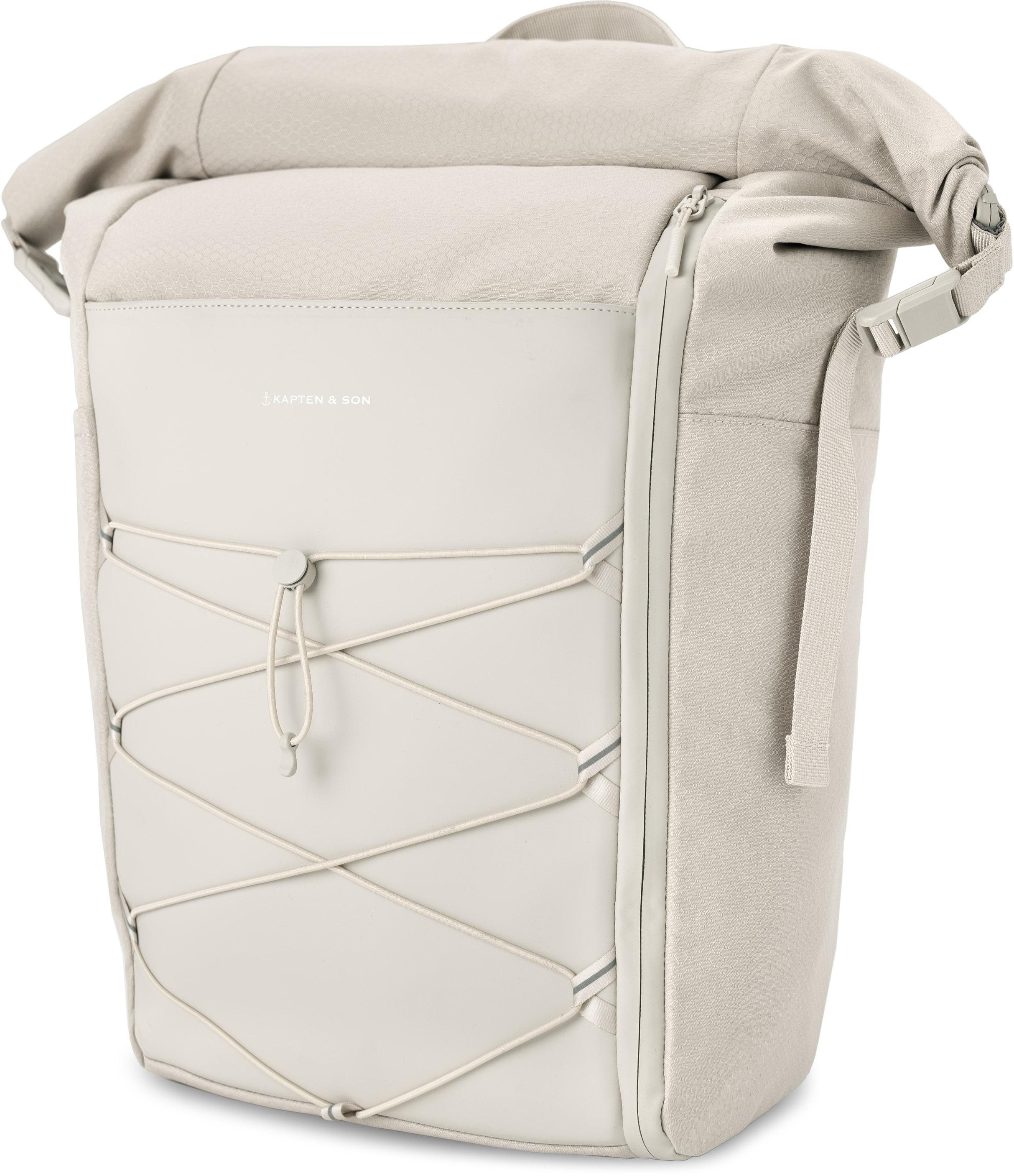 Daypack aus einem strapazierfähigem und wetterfestem Mix aus veganem Tech-Material, Recyclingmaterial und Ripstop; höhenverstellbarer Rolltop-Verschluss mit Magnetverschluss; geräumiges Hauptfach mit integriertem Laptopfach für Laptops bis zu 16“ (39 x 25 x 3 cm); zusätzlichen Zugriff auf das Hauptfach durch Reißverschluss im Rückenbereich sowie vom Anti-Diebstahlfach auf der Front; Seitentasche, ideal für Getränkeflaschen; 1 Frontfach mit Reißverschluss; das elastische Band mit Stopper auf der Front sorgt für noch mehr Stauraum, indem Jacken, Pullover oder Ähnliches damit transportiert werden kann wenn diese nicht gebraucht werden; gepolsterter Kontaktrücken mit Brustgurt; reflektierende Elemente; erweiterbares Volumen: ca. 24 bis 30 Liter; Maße (H/B/T): ca. 60 x 41 x 15 cm.