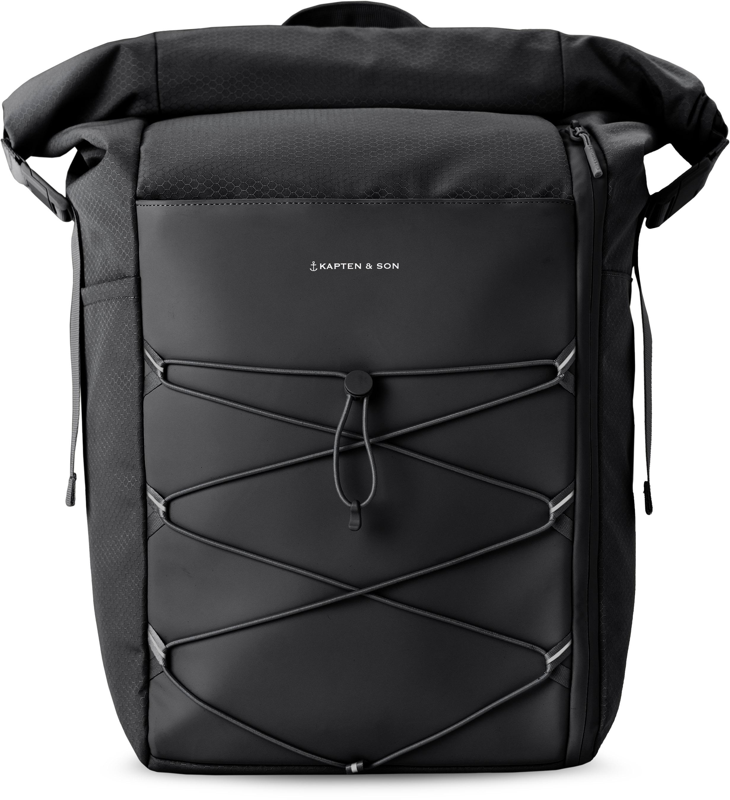 Daypack aus einem strapazierfähigem und wetterfestem Mix aus veganem Tech-Material, Recyclingmaterial und Ripstop; höhenverstellbarer Rolltop-Verschluss mit Magnetverschluss; geräumiges Hauptfach mit integriertem Laptopfach für Laptops bis zu 16“ (39 x 25 x 3 cm); zusätzlichen Zugriff auf das Hauptfach durch Reißverschluss im Rückenbereich sowie vom Anti-Diebstahlfach auf der Front; Seitentasche, ideal für Getränkeflaschen; 1 Frontfach mit Reißverschluss; das elastische Band mit Stopper auf der Front sorgt für noch mehr Stauraum, indem Jacken, Pullover oder Ähnliches damit transportiert werden kann wenn diese nicht gebraucht werden; gepolsterter Kontaktrücken mit Brustgurt; reflektierende Elemente; erweiterbares Volumen: ca. 24 bis 30 Liter; Maße (H/B/T): ca. 60 x 41 x 15 cm.