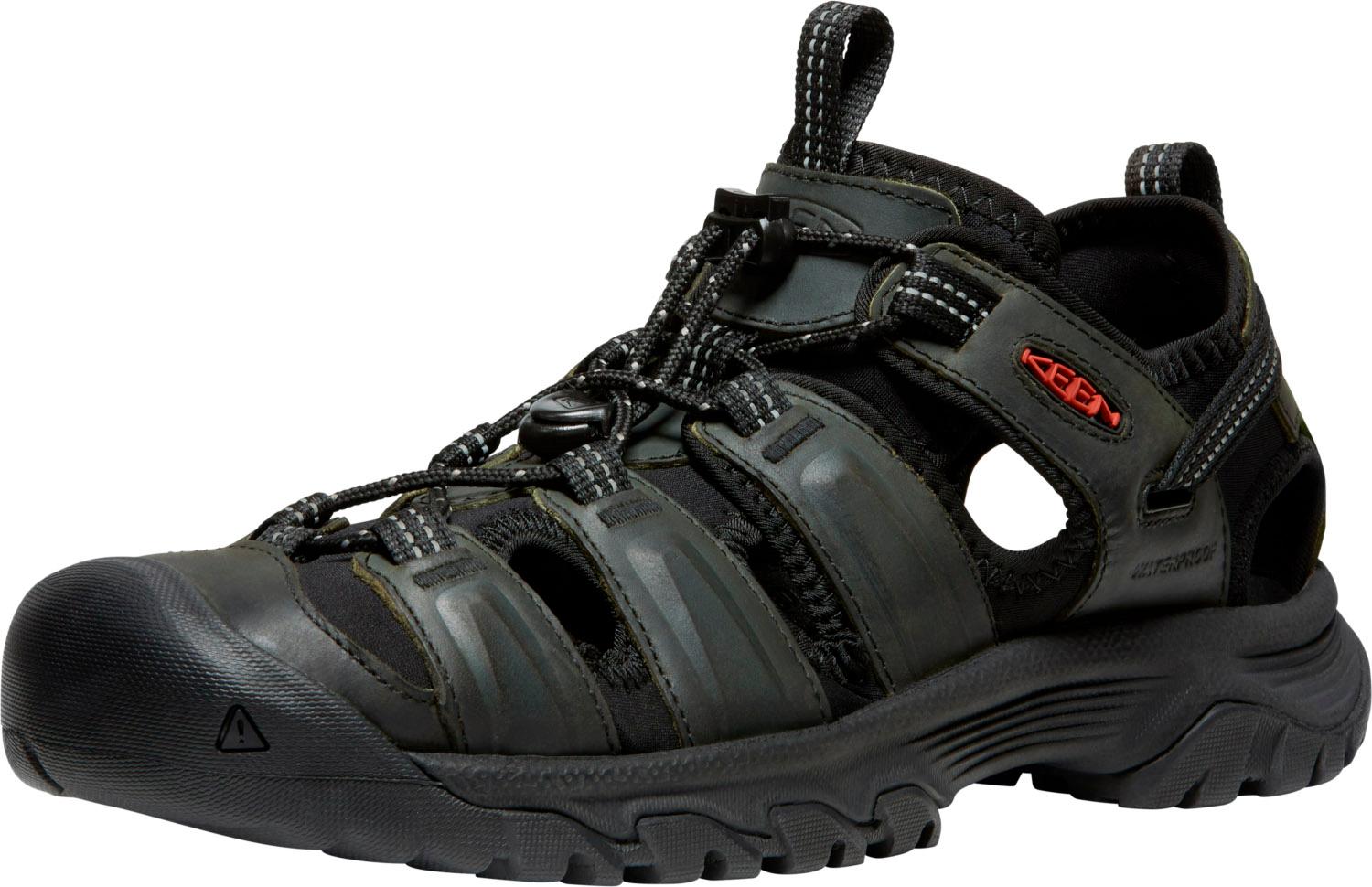 Outdoorsandalen mit geräumiger Passform und robuster Außensohle; ideal für Trails; wasserdichtes Obermaterial aus Leder; Schnellschnürverschluss mit Stopper; Zuglaschen vorne und hinten; Zehenschutz; schnelltrocknendes Futter; dämpfende EVA-Zwischensohle mit Fußgewölbe-Unterstützung; abriebfeste Gummi-Außensohle mit Multidirektions-Stollenmuster für optimale Traktion.