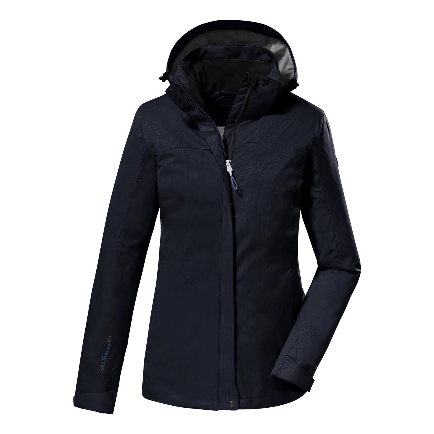 Damen Funktionsjacke mit verstellbarer, abzippbarer Kapuze10.000 mm Wassersäule, verschweißte Nähte, wasserdichtatmungsaktiv, Wasserdampfdurchlässigkeit 3.000 g/m²/24hPFAS-freie Imprägnierung – gut für dich und die UmweltSaum und Ärmelbündchen verstellbarverdeckter Reißverschluss mit Kinnschutz, ZippertaschenName: KOS 133 WMN JCKT Saison: Frühjahr/SommerDie Damen Funktionsjacke von killtec schützt zuverlässig vor Wind und Regen. Sie ist wasser- und winddicht und hat verschweißte Nähte sowie eine 10.000 mm Wassersäule (Unser Tipp: ab und zu sollte die Jacke neu imprägniert werden). Die abzippbare Kapuze lässt sich individuell verstellen. Die Ärmelbündchen lassen sich mit Klettverschlüssen regulieren. Die Saumweite ist durch einen Kordelzug verstellbar. Der verdeckte Reißverschluss ist mit einem Kinnschutz versehen, der ein Einklemmen der Haut verhindert. Die beiden Seitentaschen sind mit Zippern verschließbar, eine Innentasche bietet zusätzlichen Stauraum. killtec liegt es besonders am Herzen, die Kollektionen nachhaltiger und zukunftsfähiger zu machen. So setzt killtec verstärkt auf verantwortungsbewusstere Herstellungsverfahren. Diese Jacke wurde daher PFAS-frei imprägniert.