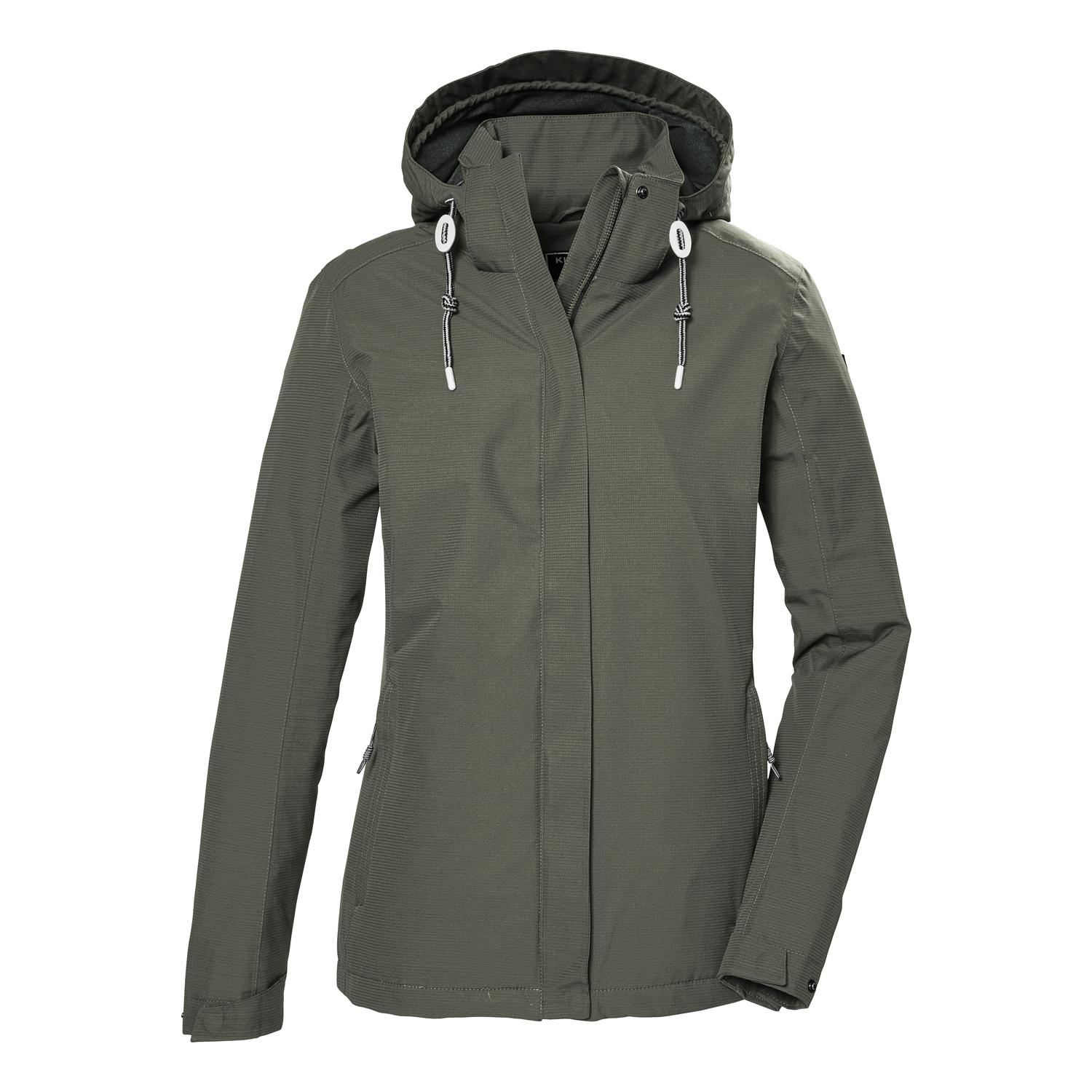 Damen Funktionsjacke mit regulierbarer, abzippbarer Kapuze 10.000 mm Wassersäule, verschweißte Nähte, wasserdicht atmungsaktiv, Wasserdampfdurchlässigkeit 3.000 g/m²/24h verstellbare Bündchen, verdeckter Zipper mit Kinnschutz PFAS-freie Imprägnierung – gut für dich und die Umwelt Seitentaschen mit Zippern, Handytasche innen Name: KOS 61 WMN JCKT Saison: Frühjahr/Sommer Die Damen Funktionsjacke von killtec begleitet zuverlässig durch den Sommer und die Übergangszeit. Sie hat verschweißte Nähte und ist mit einer Wassersäule von 10.000 mm wasser- und winddicht (Unser Tipp: ab und zu sollte die Jacke neu imprägniert werden). Gleichzeitig ist sie atmungsaktiv mit einer Wasserdampfdurchlässigkeit von 3.000 g/m²/24 h. Die Kapuze lässt sich regulieren und bei Bedarf ganz abnehmen. Die Ärmelbündchen sind durch Klettverschlüsse verstellbar. Der verdeckte Reißverschluss ist mit einem praktischen Kinnschutz versehen. Die zwei Seitentaschen lassen sich mit Zippern verschließen, sodass nichts verloren geht. Eine Handytasche im Inneren bietet weiteren Stauraum. killtec liegt es besonders am Herzen, die Kollektionen nachhaltiger und zukunftsfähiger zu machen. So setzt killtec verstärkt auf verantwortungsbewusstere Herstellungsverfahren. Diese Jacke wurde daher PFAS-frei imprägniert.