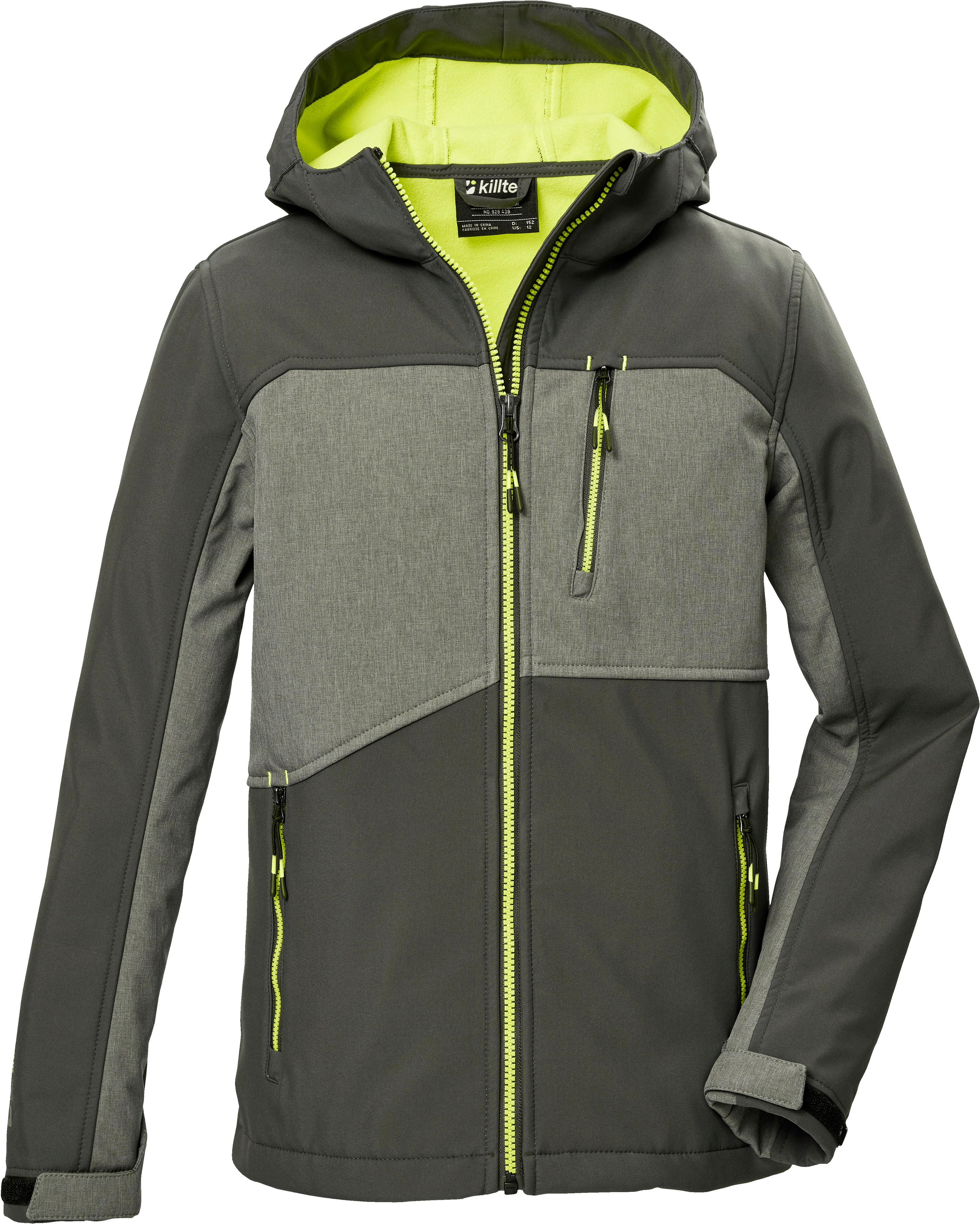 Wind- und wasserabweisende Softshelljacke mit Kapuze; Wassersäule 10.000 mm; durchgehender Frontreißverschluss mit Kinnschutz; Brusttasche und 2 Seitentaschen mit Reißverschluss; verstellbare Ärmelbündchen; Mesh-Einsatz und warmes Fleecematerial im Rückenbereich für Komfort und Wärme; Saum mit Kordelzug zur Weitenregulierung; fluorfreie Imprägnierung; Material 100% Polyester.