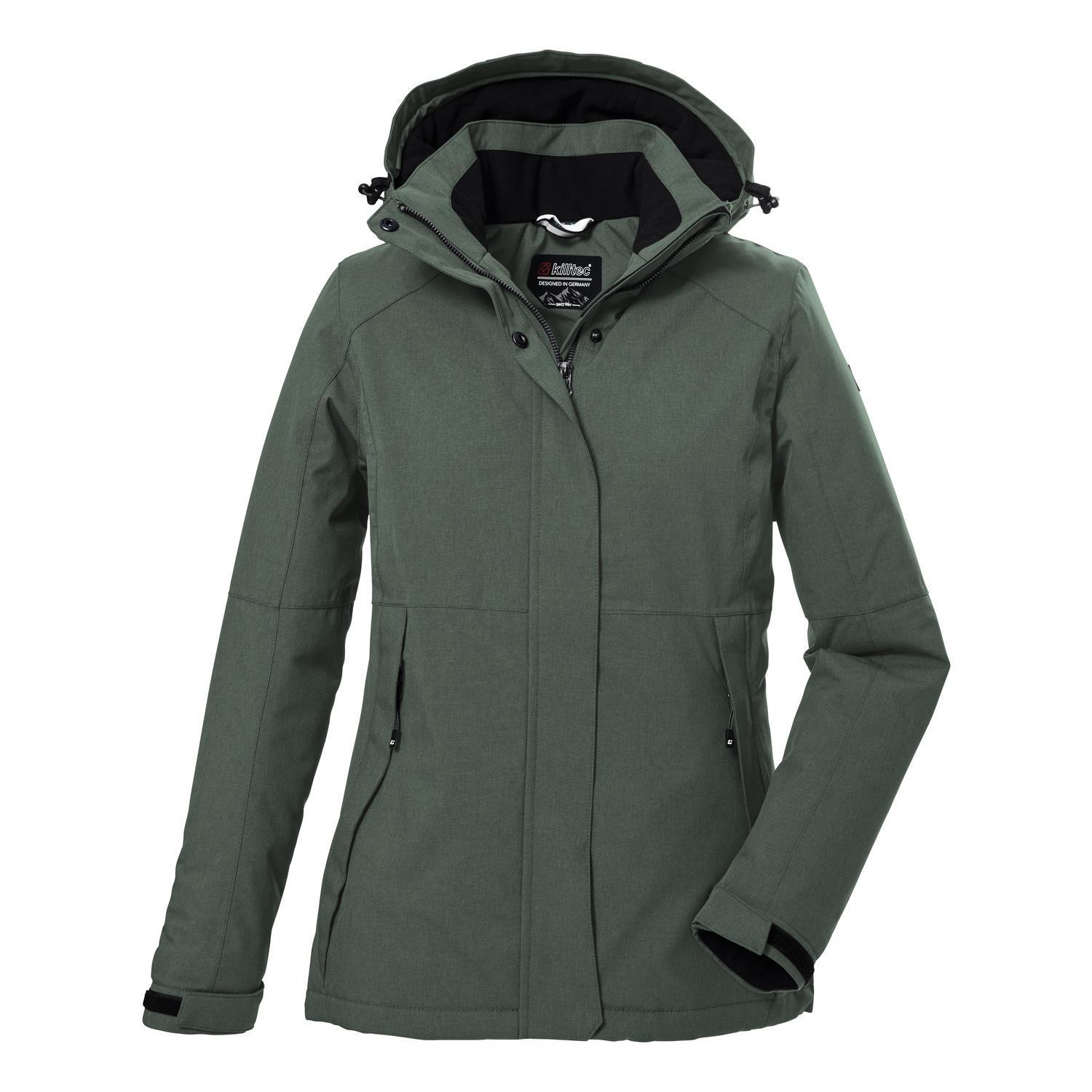 Funktionsjacke mit regulierbarer, abzippbarer Kapuze10.000 mm Wassersäule, verschweißte Nähte, wasserdichtatmungsaktiv (3.000 g/m²/24 h)Ärmelbündchen verstellbar, Taschen mit ZippernPFAs-freie Imprägnierung, gut für dich und die UmweltName: KOW 37 WMN JCKTSaison: Herbst/WinterDie Damen Funktionsjacke von killtec besticht durch ihr zeitloses Design und funktionale Eigenschaften. Sie ist durch verschweißte Nähte und mit einer 10.000 mm Wassersäule wasser- und winddicht (Unser Tipp: Ab und zu sollte die Jacke neu imprägniert werden). Gleichzeitig ist die Jacke atmungsaktiv mit einer Wasserdampfdurchlässigkeit 3.000 g/m²/24 h. Die Kapuze mit Gummizug ist regulierbar und lässt sich bei Bedarf abzippen. Die Ärmelbündchen sind durch Klettverschlüsse verstellbar. Der Saum lässt sich anhand eines Kordelzuges regulieren. Die zwei Seitentaschen und eine Innentasche bieten genügend Stauraum. Der Kinnschutz am verdeckten Frontreißverschluss verhindert ein Einklemmen der Haut. killtec liegt es besonders am Herzen, die Kollektionen nachhaltiger und zukunftsfähiger zu machen. So setzt killtec verstärkt auf verantwortungsbewusstere Herstellungsverfahren. Diese Jacke wurde daher mit fluorfreien Mitteln imprägniert.