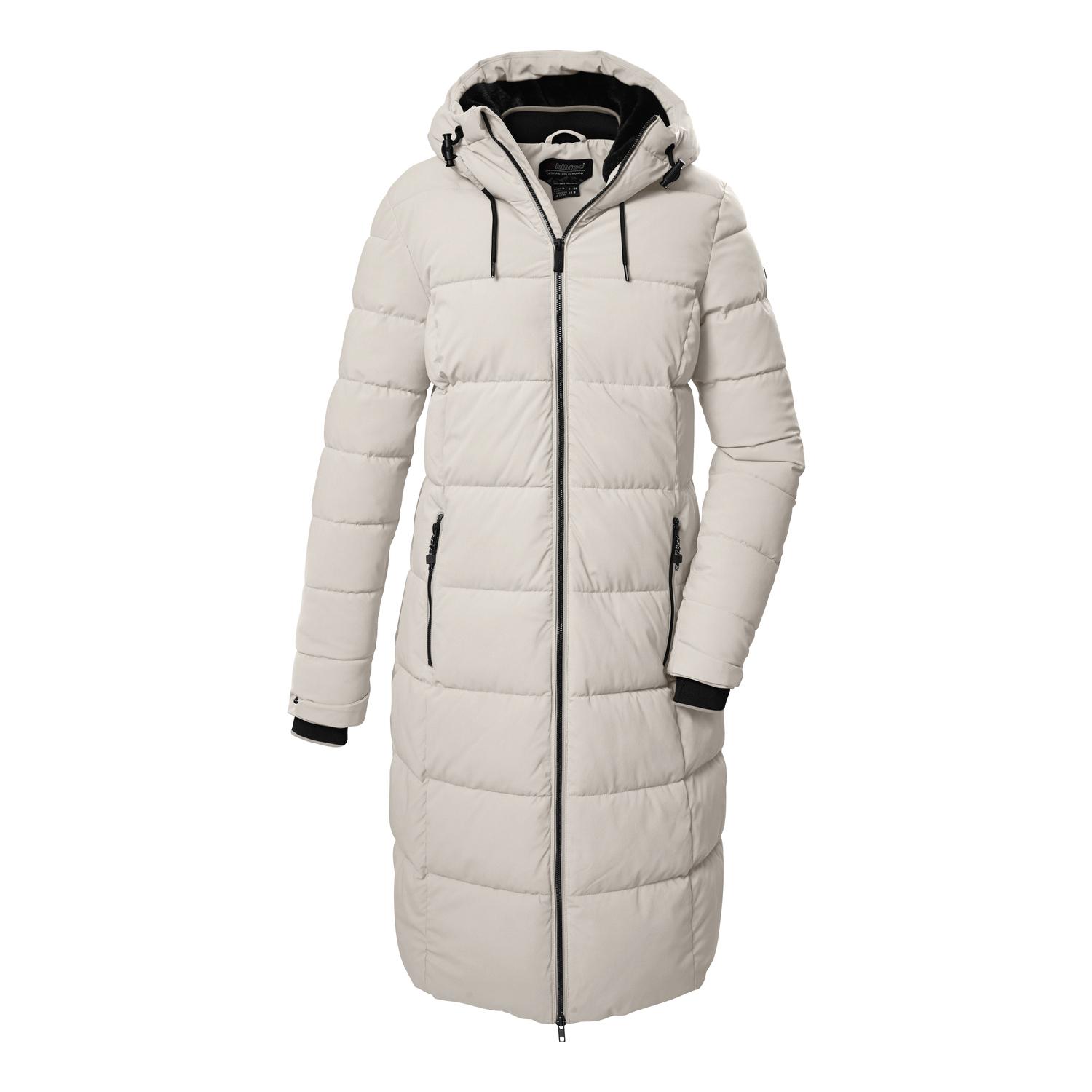 Damen Wintermantel in Daunenoptik mit regulierbarer Kapuzewinddicht und wasserabweisend (10.000 mm), atmungsaktivdicke Füllung und gefütterte Kapuze2-Wege-Zipper, praktische Taschenverstellbare Ärmelabschlüsse mit StrickbündchenName: KOW 56 WMN QLTD CTSaison: Herbst/WinterDer lange Damen Wintermantel in Daunenoptik begleitet zuverlässig durch die kältere Jahreszeit. Der Mantel ist winddicht und wasserabweisend mit einer 10.000 mm Wassersäule. Gleichzeitig ist er atmungsaktiv mit einer Wasserdampfdurchlässigkeit von 3.000 g/m²/24 h. Die weich gefütterte Kapuze lässt sich regulieren und schützt vor Kälte und Wind. Die dicke Füllung des Mantels hält zusätzlich warm. Der 2-Wege-Reißverschluss ist mit einem praktischen Kinnschutz versehen. An den verstellbaren Ärmelabschlüssen befinden sich bequeme Strickbündchen. Zwei seitliche Zipper-Taschen sowie eine Innentasche bieten ausreichend Stauraum für alle wichtigen Dinge. killtec liegt es besonders am Herzen, die Kollektionen nachhaltiger und zukunftsfähiger zu machen. So setzt killtec verstärkt auf verantwortungsbewusstere Herstellungsverfahren. Dieser Wintermantel wurde daher mit fluorfreien Mitteln imprägniert und wurde teilweise aus recyceltem Material hergestellt.