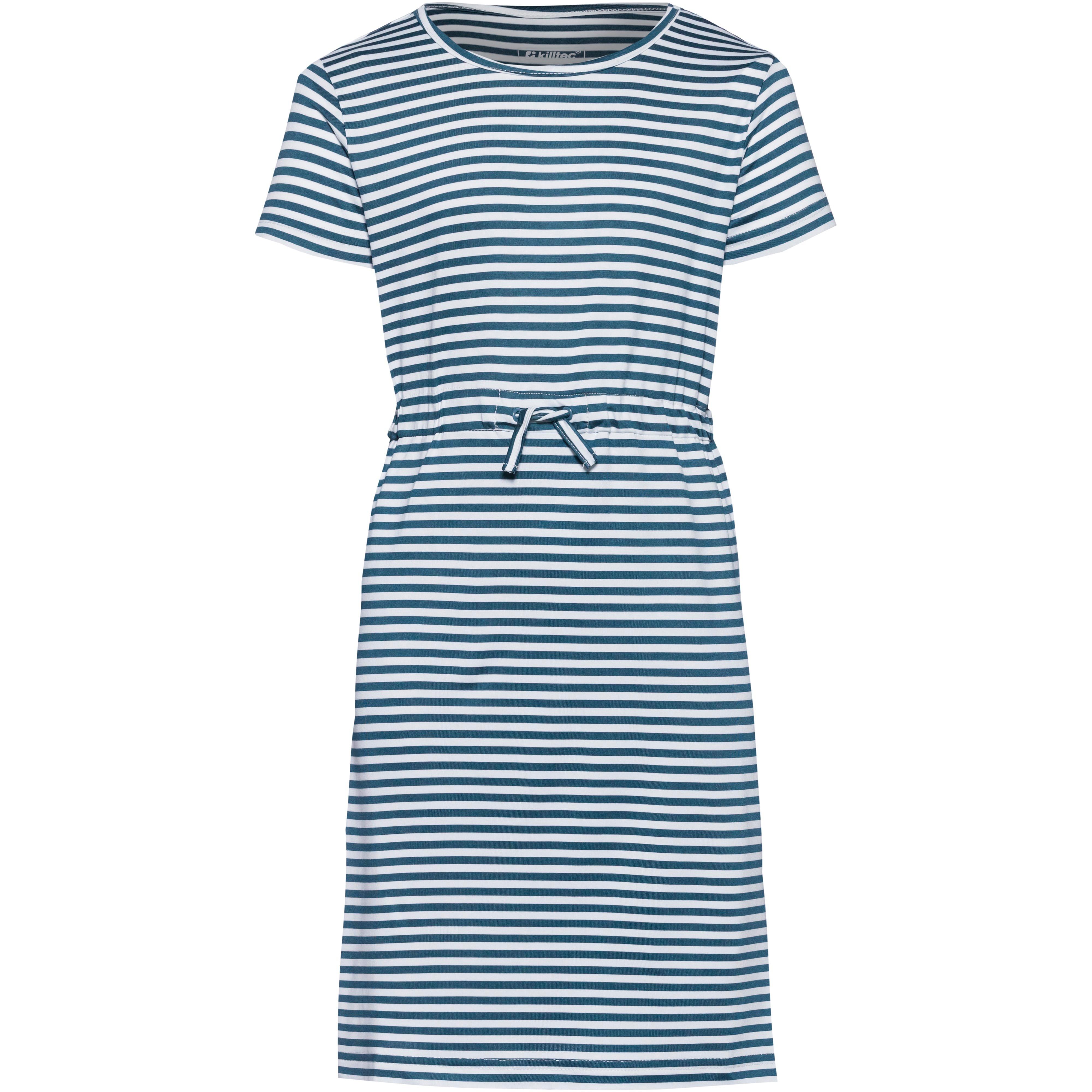 Gestreiftes, kurzärmliges T-Shirt-Kleid mit Rundhalsausschnitt; Kordelzug in der Taille; Material 95% Polyester, 5% Elastan.