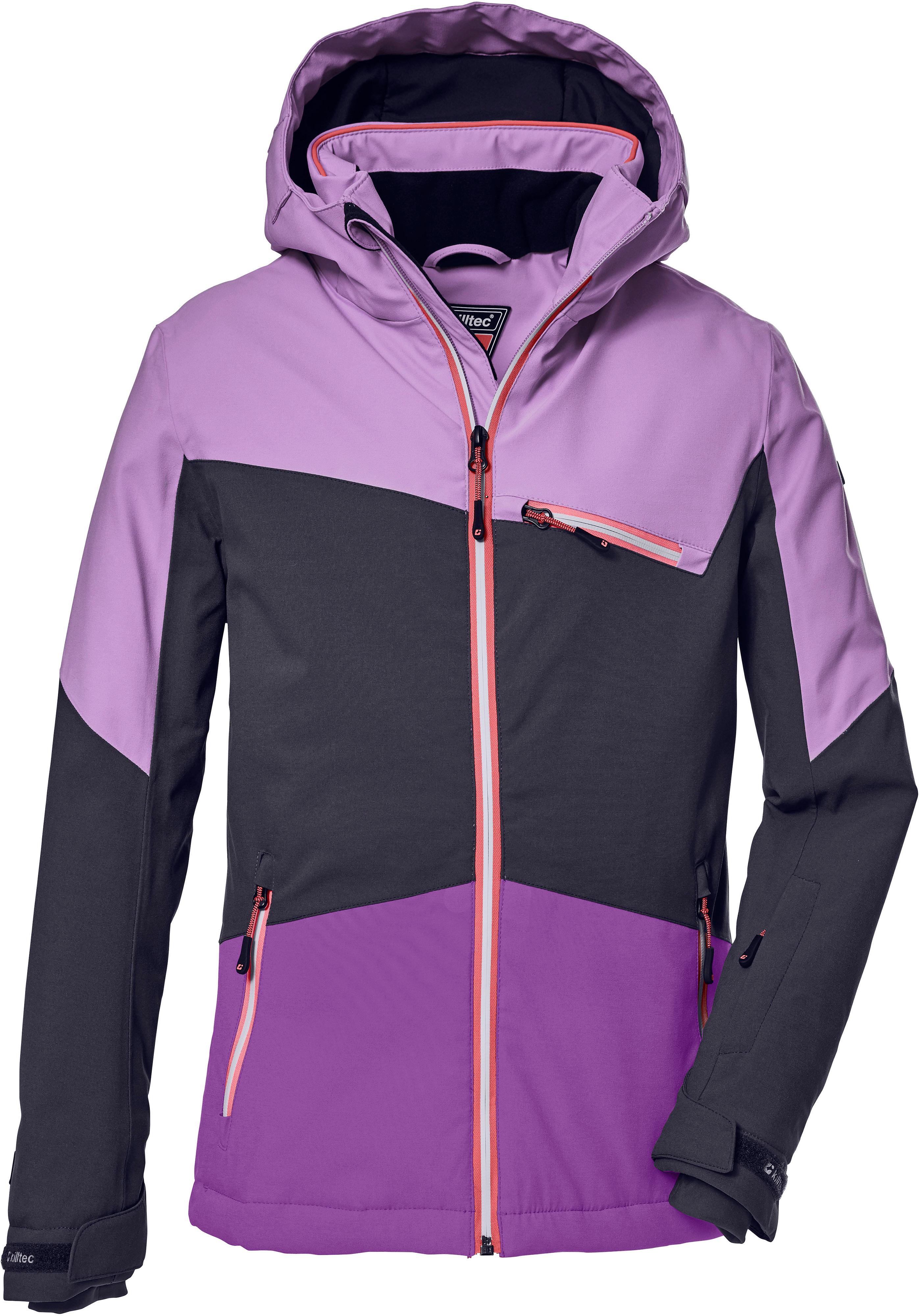 Gefütterte Skijacke mit asymmetrischem Colorblock-Design für Mädchen; wind- und wasserabweisend; feste Kapuze; Stehkragen; durchgehender Reißverschluss; 1 Brusttasche und 2 seitliche Eingrifftaschen mit Reißverschluss; Liftpasstasche am Ärmel; weitenregulierbare Ärmelabschlüsse mit Klettriegeln; integrierte, elastische Cuffs; normale Passform; Material 100% Polyester.