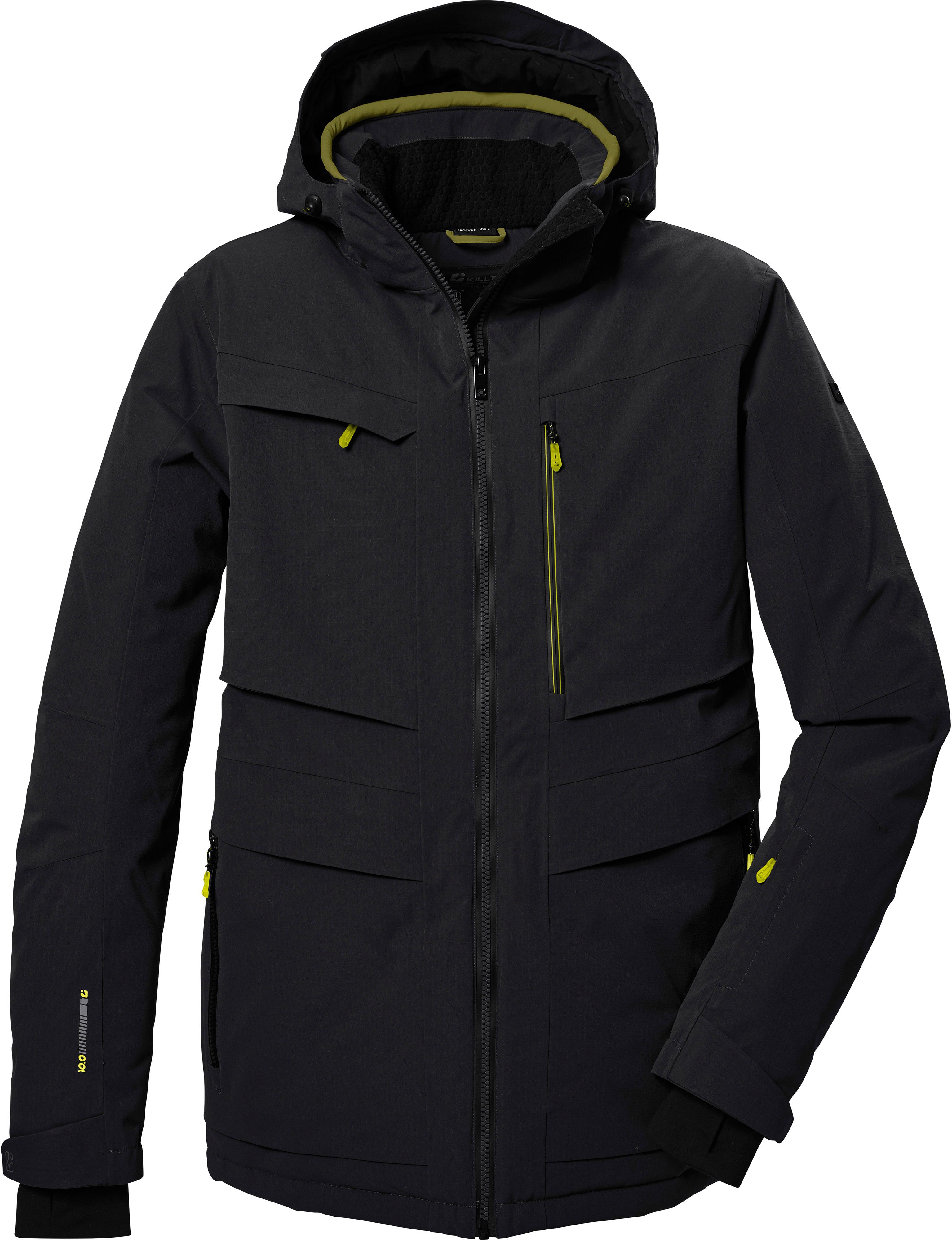 Skijacke mit wärmender Wattierung aus Recyclingmaterial; wasserdicht mit verschweißten Nähten und ohne PFC hergestellter Imprägnierung; Wassersäule: 10.000 mm; atmungsaktiv; verstellbare Kapuze, welche bei Bedarf abgenommen werden kann; Frontreißverschluss mit Kinnschutz am Kragen; 1 Brusttasche mit Reißverschluss, 1 Fake-Brusttasche mit Patte, 2 seitliche Reißverschlusstaschen und 1 Liftpasstasche mit Reißverschluss; verstellbare Ärmelbündchen mit Klettriegeln und Innenbündchen mit Daumenlöchern; Saum mit Kordelzug weitenregulierbar; rutschfester Schneefang verhindert Eindringen von Schnee und Kälte; Obermaterial, Futter und Isolierung 100% Polyester.
