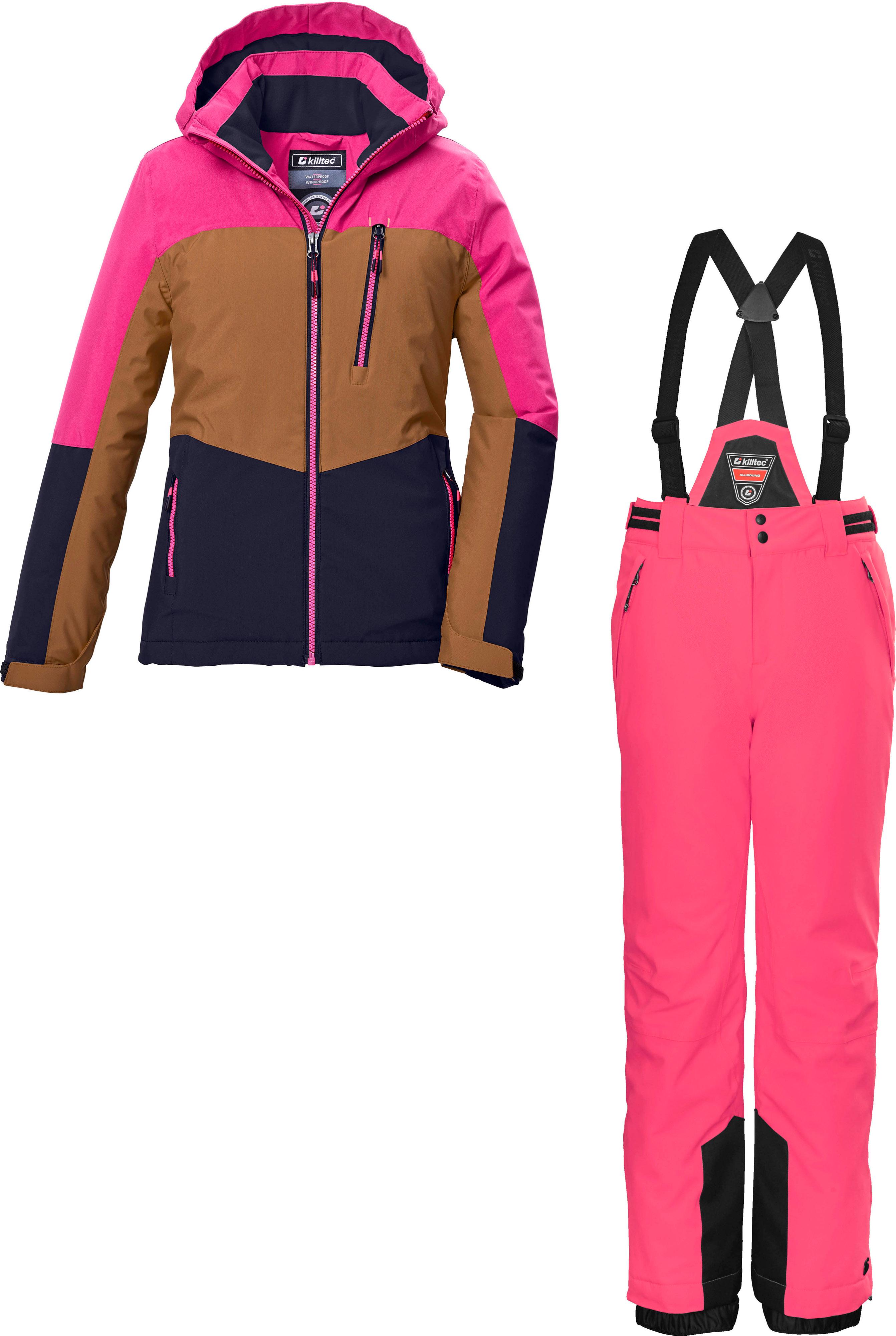 Skianzug aus wasserdichtem Material mit atmungsaktivem PU-Laminat; verschweißte Nähte und ohne PFC hergestellte Behandlung; Wassersäule: 10.000 mm; Jacke mit wärmender, synthetischer Isolierung und partiell mit weichem Fleecefutter; feste Kapuze und hoher Kragen; durchgehender Frontreißverschluss; Brusttasche und 2 Seitentaschen, jeweils mit Reißverschluss; Ärmelbündchen mit Klettriegeln weitenregulierbar; integrierter Schneefang; Hose mit abzippbarem Latz am Rücken; verstellbare Hosenträger; weitenregulierbarer Bund mit Klettriegeln und Gürtelschlaufen; 2 seitliche Reißverschlusstaschen; strapazierfähiger Kantenschutz an den Beinabschlüssen; integrierte Gamaschen; Obermaterial, Futter und Isolierung 100% Polyester.